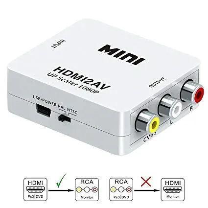 Вход стандартных ТВ-форматов PAL/N. 4. Поддержка HDMI 1080 p или 720 p выход. Особенности» 1. Входные порты: 1xrca (желтый, белый, красный). 2. Выходные порты: 1xHDMI. 3. Размеры (мм): 66 (D) x 55 (Ш) x 20 (В) 4. Wight (g): 40 5. Композитное Введение: