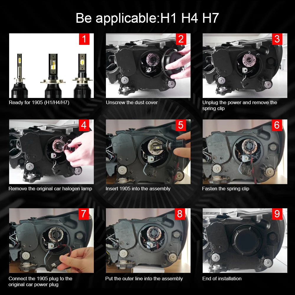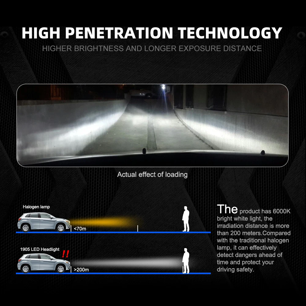 Номер детали производителя: светодиодный налобный фонарь 1905 Мощность: 60 Вт/пара, 30 Вт/лампа Высокая световая эффективность потока: 12000 лм/пара 6000LM/лампа Светодиодный чип: чип CSP Корпус: 6360 алюминий Рабочая температура:- 40 ℃ до 80 ℃ Угол луча: 360 ° Водонепроницаемый: IP68. Напряжение: от 9 в до 36 В. Широкий диапазон напряжения, постоянное управление urrent, конструкция цепи от помех. Appriation: обновление для автомобилей, грузовиков, внедорожников, RV HID ксеноновых фар, все в одном стиле, без дополнительных драйверов. Дальность действия: 6000K Цветовая температура и дальность освещения 200 м.