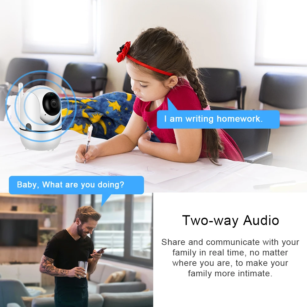 Двустороннее аудио в режиме реального времени. Камера оснащена микрофоном и динамиком. Так что вы можете говорить со своими детьми через смартфон удаленно, когда захотите.