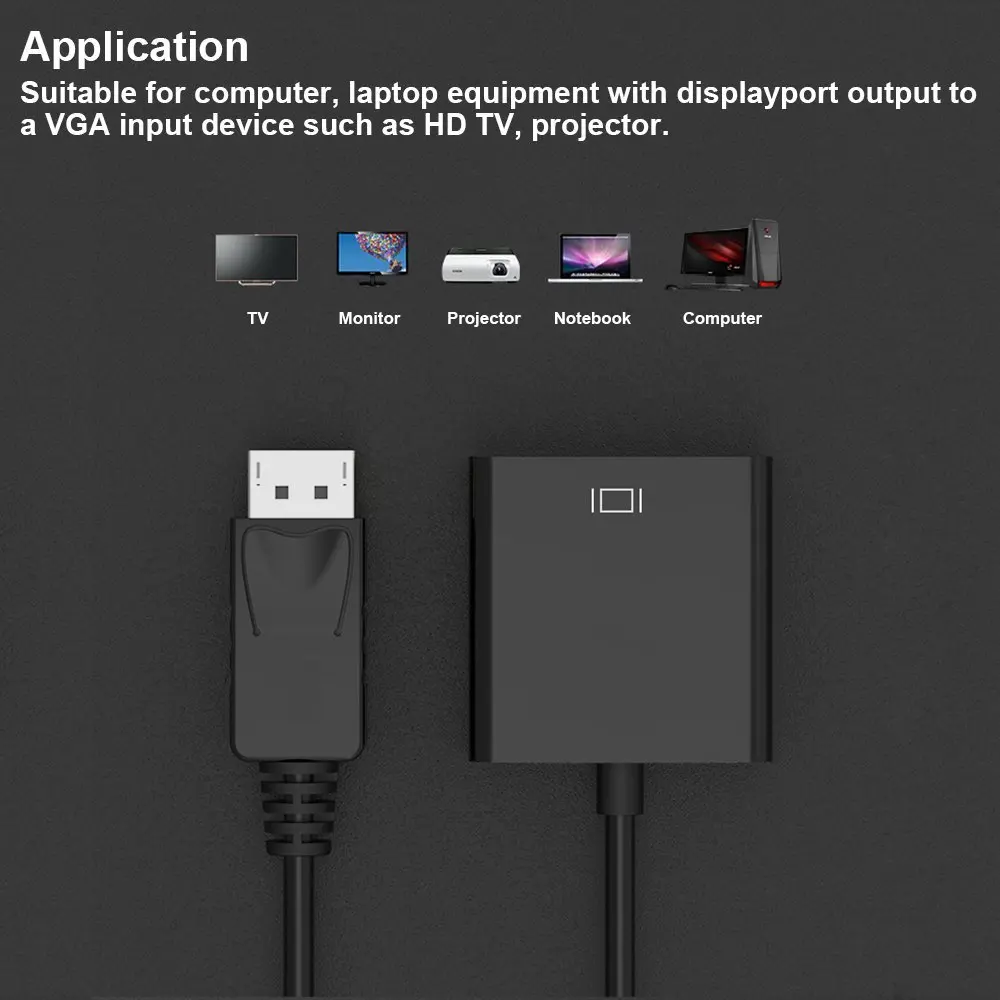 Порт дисплея является одним из основных разъемов для передачи аудио/видео и дисплея. Адаптер с чипсетом преобразования внутри, конвертация сигнала от displayport к VGA. Коэффициент разрешения VGA до 1920x1200. Он также поддерживает 1080P.
