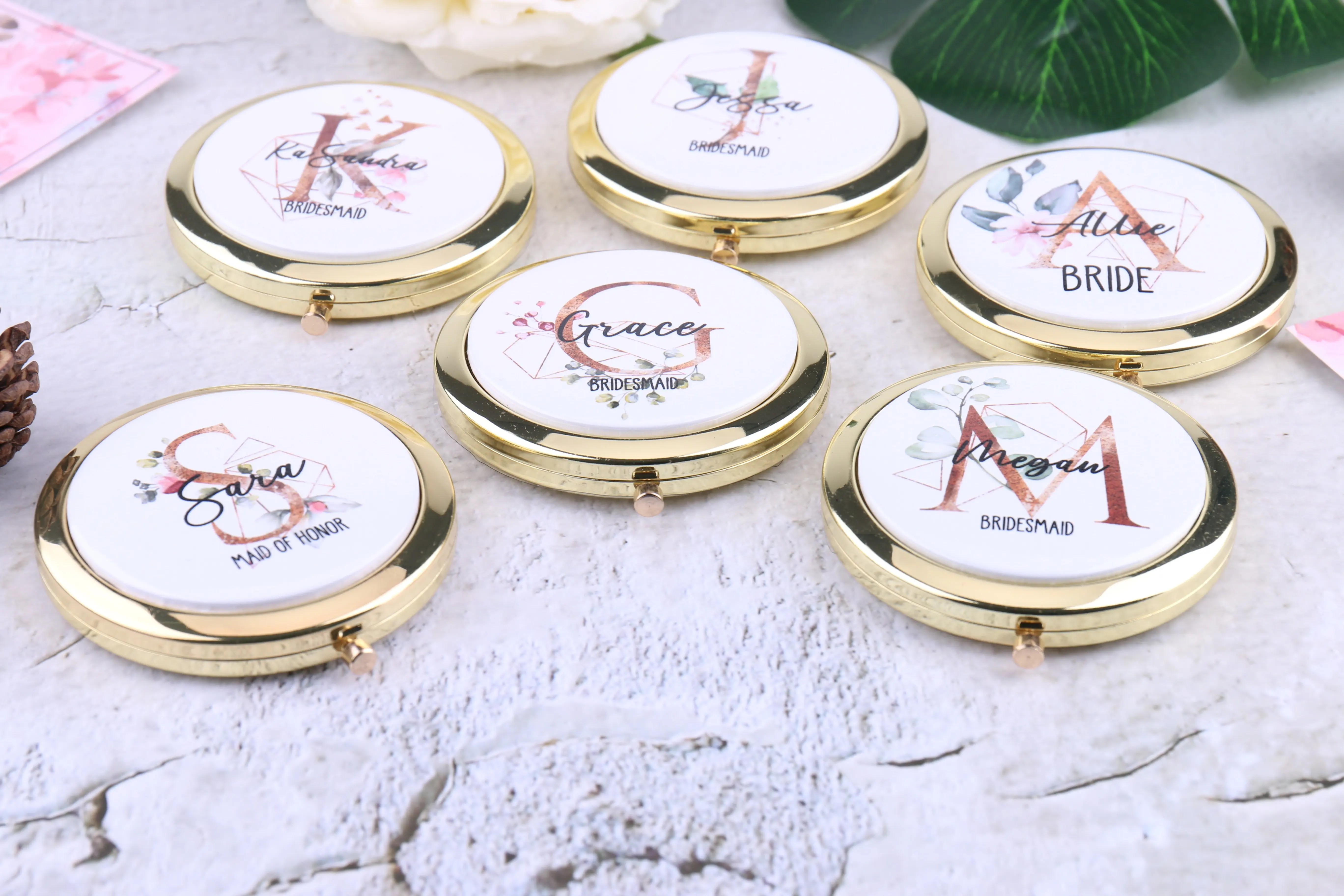 Индивидуальные зеркальные компактные изделия-милые подарки для подружек невесты или любой женщины на вечерние. Подружки невесты и подружки невесты могут положить их в кошельки или сделать сумки для ежедневных контактов. Эти великолепные металлические компактные зеркала поставляются с красивым именем/словом, и в вашем выборе в цвете на ваш выбор. Уникальный подарок для любой женщины!