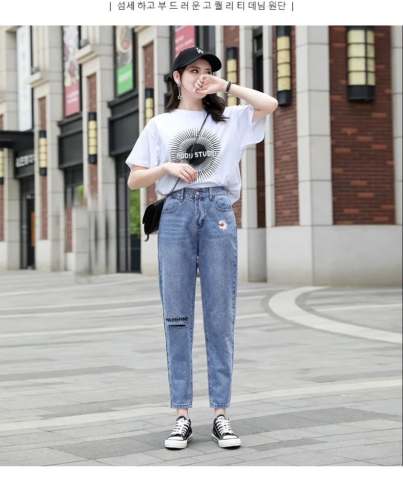 Осень-зима 2020, новые джинсы с вышитой маргариткой для папы, женские повседневные брюки с отворотами
