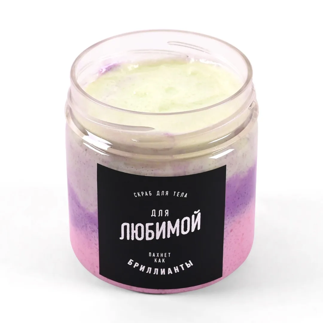 Soft gentle creamy body scrub. The consistency resembles a thick sour cream. Looks like pink, lilac and green diamond overflows. Flavor: vanilla champagne.