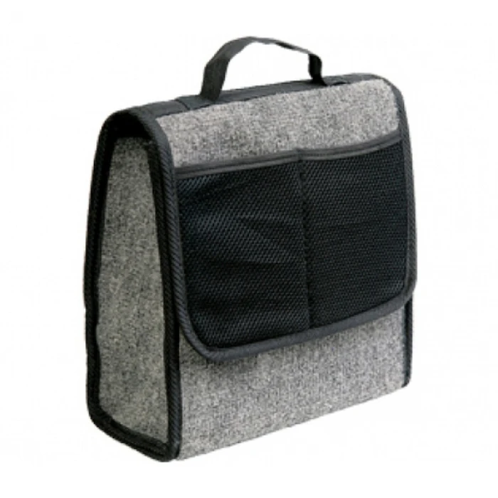 Компактный органайзер-сумка для автомобильного багажника. Сделан из прочного ковролина серого цвета с характерной фактурой. В таком органайзере можно разместить автохимию, инструменты, автоаксессуары.