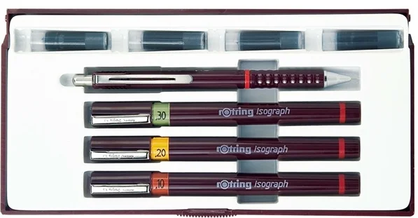В наборе: 3 изографа; карандаш Tikky красный 0,5; 4 картриджа с тушью.