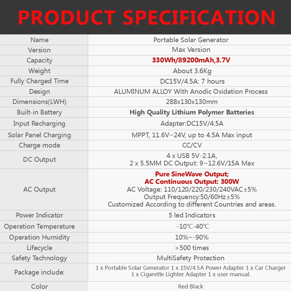 ◆Модель: HD300MAX Размер: 288*130*130 мм ◆Емкость: 89200 мАч (330Wh) ◆Выход: 1)2 x выход постоянного тока 9 ~ 12V/15A Max 2)2 x непрерывный выход переменного тока: 300 Вт 3) 4xusb 5В/2.1A ◆Входная Зарядка: адаптер DC15V/4.5A ◆Вход солнечной панели: 11,6 V ~ 24V/4.6A Max Время полной зарядки: около 7 часов ◆Рабочая температура:-20 ℃ ~ 85 ℃ ◆Гарантия: 12 месяцев ◆Товар: электростанция ◆Место происхождения: Гуандун, Китай ◆Размер: 288*130*130 мм ◆Вес: 3,6 кг ◆Срок службы: 1000 +