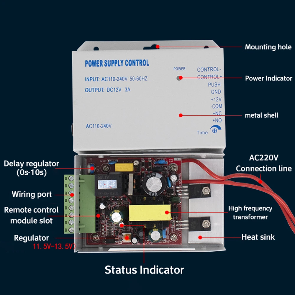 Этот продукт изготовлен из высококачественного материала и передовой международной технологии, он имеет анти-помехи, обеспечивает очень стабильную и надежную выходную мощность в различных применениях, таких как контроль блокировки, контроль контроллера, кнопка выхода, считыватель RFID карт и т. Д.