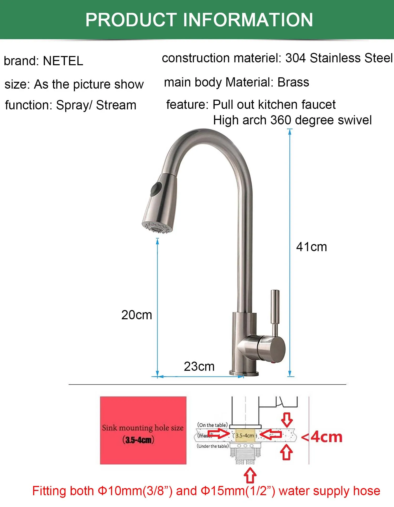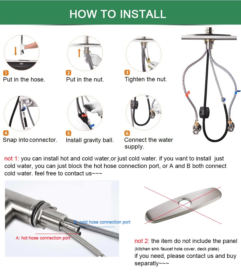 Бренд: нетел Материал: нержавеющая сталь 304 Поверхность: матовый никель, пыленепроницаемый, устойчив к потускнению и коррозии от ежедневного использования Характеристики: плавный поток/распыление воды, без капель. Вытяжка: 60 см, одна ручка, вытяжной распылитель и вращение на 360 градусов Установка 1: фитинг ф10мм (3/8 ”) и ф15мм (1/2”) шланг для водоснабжения. Установка 2: два способа установки: горячая и холодная вода или просто холодная. Примечание: панель в комплект не входит. Пожалуйста, при оформлении заказа отдельно. Гарантия: 1 год гарантии качества, если у вас есть какие-либо вопросы, не стесняйтесь связаться с нами.