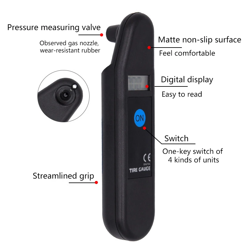 <Применение: Может использоваться с автомобилями, грузовиками, мотоциклами, велосипедами и RVs. < Легко носить с собой: компактный и легкий, удобно держать портативный манометр под рукой в вашем автомобиле или гараже.
