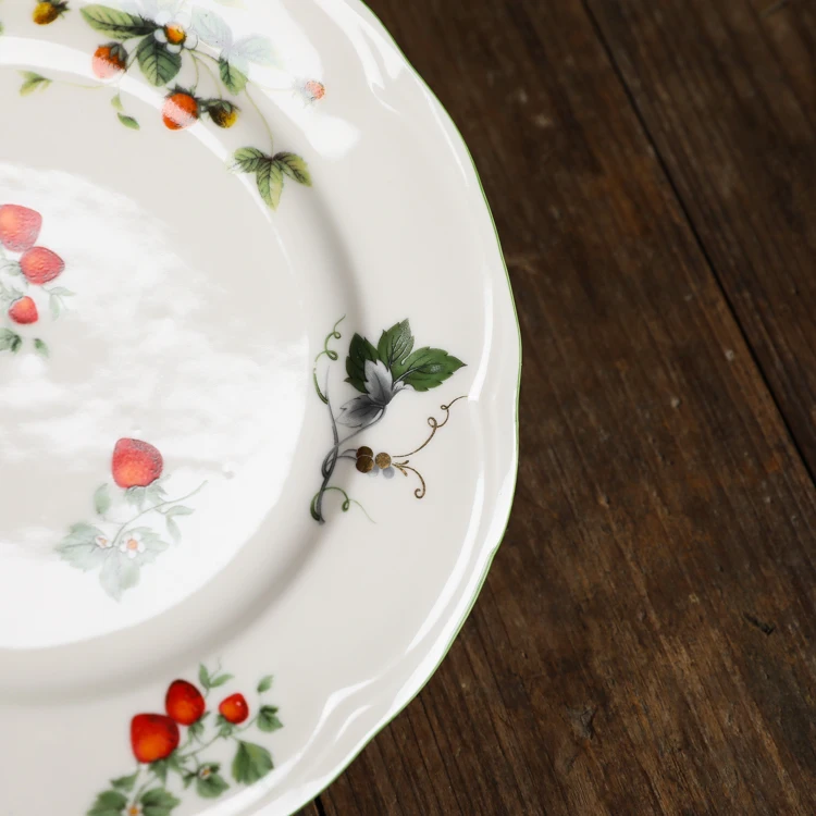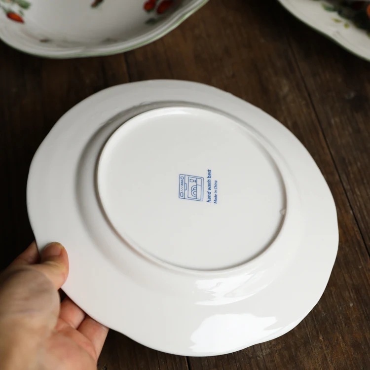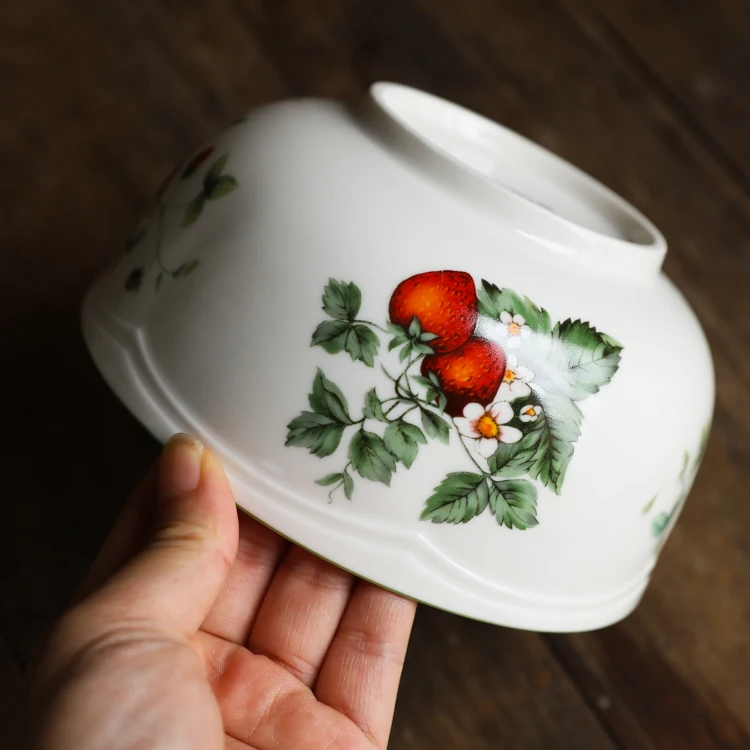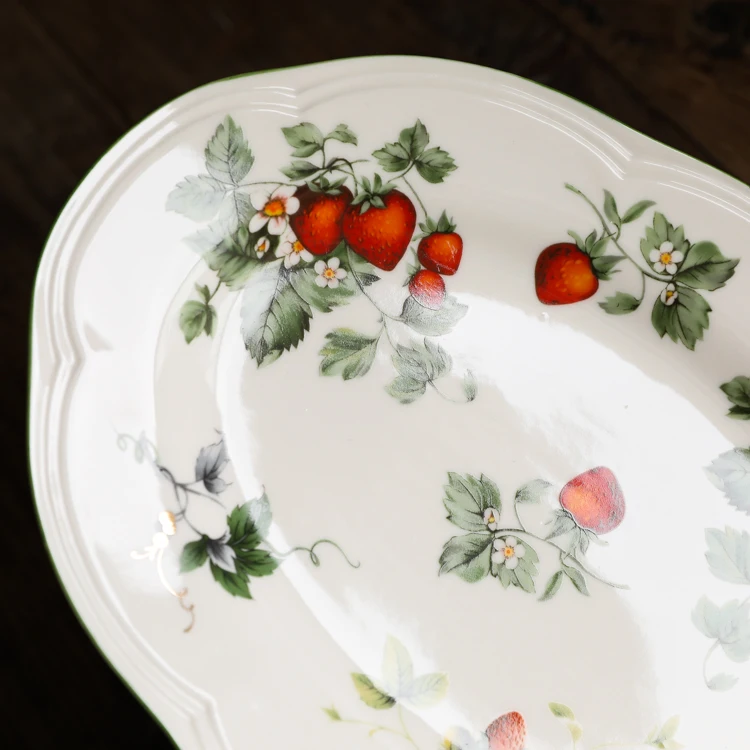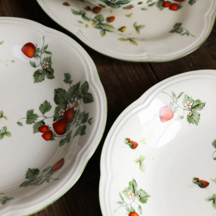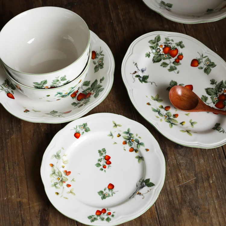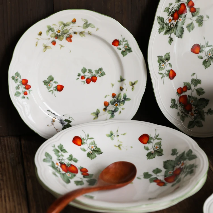 Size Big Strawberry Oval Plate(cm): 26x18x2.5 Big Strawberry Deep Plate(cm): 22x4 Big Strawberry 8m Inch Plate(cm): 20x2.5 Big Strawberry Big Bowl(cm): 15.5x7.5 Big Strawberry Small Bowl(cm): 11.5x5.5 Material: ceramic+high temperature decals Creamy base color, retro and lovely