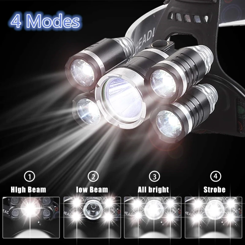 100000 Lumens100000 Lumens Bright 5 Led Headlamp XML T6 Powerful Outdoor Torch Led Headlight with 18650 battery Flashlight Lights for Fishing