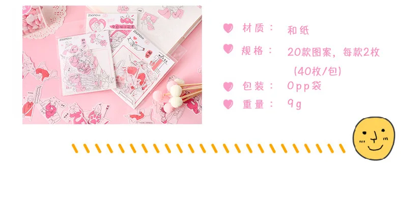 Описание продукта: Название: милые персонажи и бумажный стикер Материал: бумаги в японском стиле Упаковка: мешок из полиуретана с открытыми порами Характеристики: 20 узоров, 2 наклейки для каждого стиля, всего 40 наклеек Количество: 1 шт. = 40 шт.
