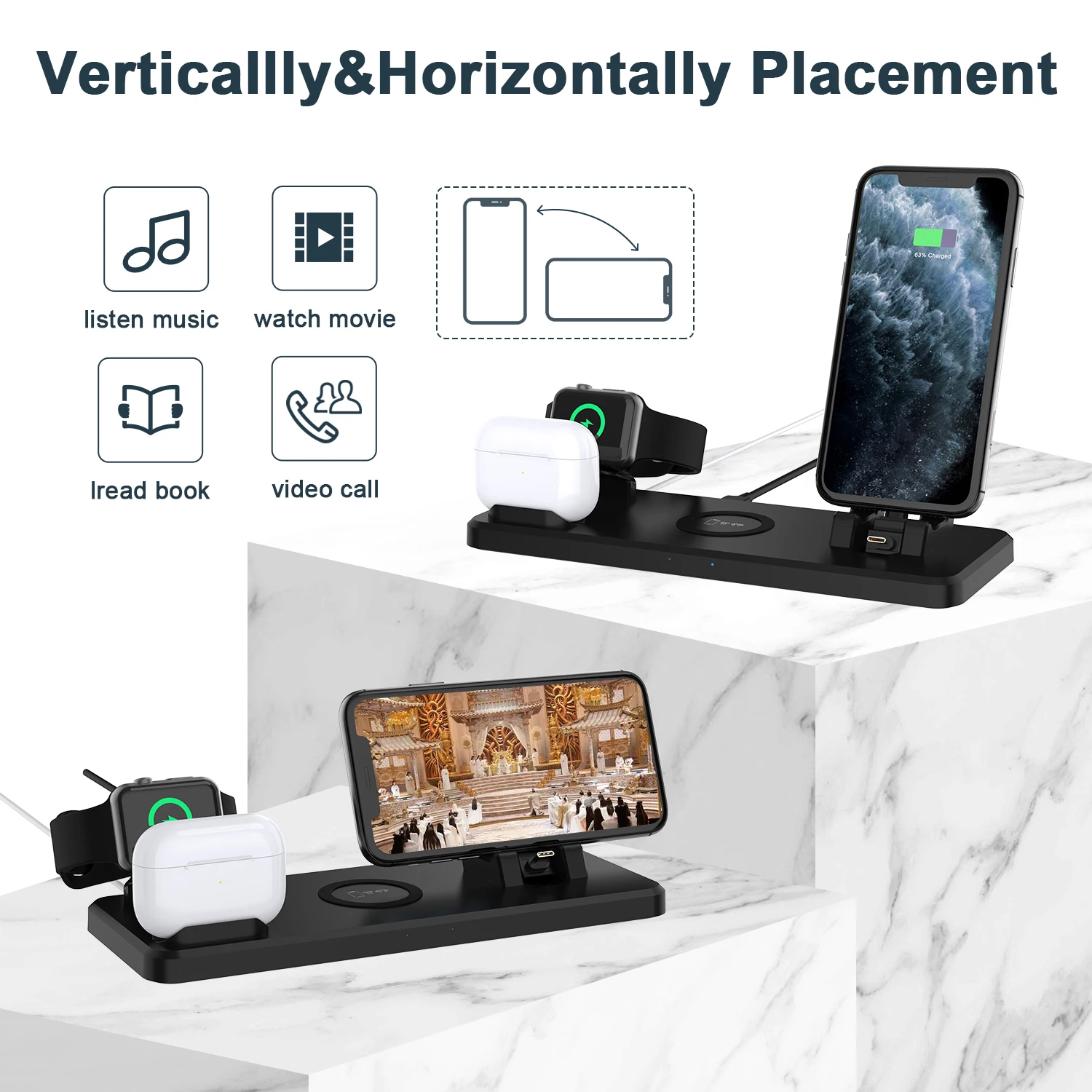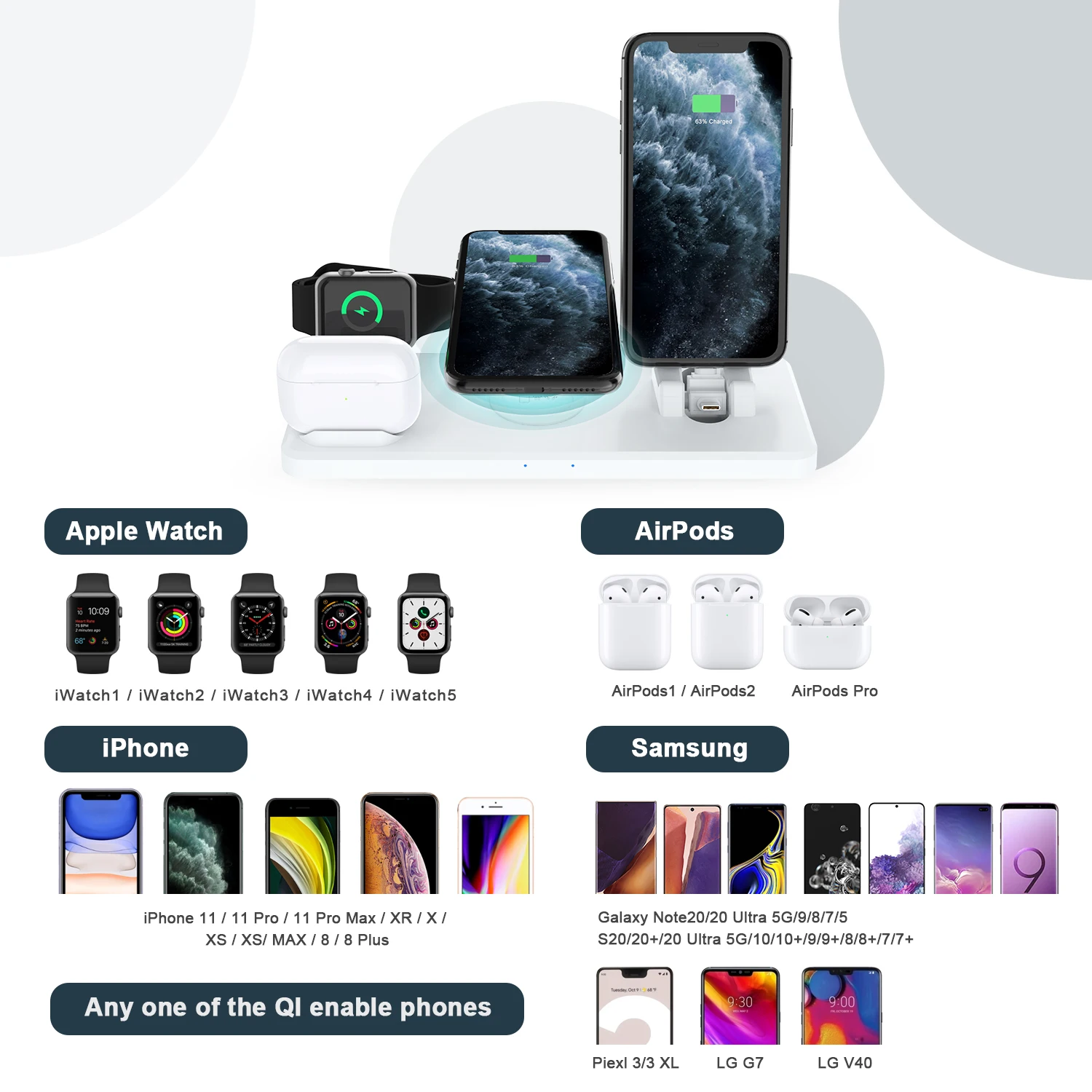 Да. Шесть устройств можно заряжать от этого одного устройства! 5 в 1 беспроводная зарядная станция, это наше новое все в одном устройстве! Почему вам нужен один? В1: вы устали от необходимости штепсельных вилок 2, 3, 4, 5 или 6 в розетках для одновременной зарядки всех ваших устройств? В2: вам нужно потратить много времени, чтобы найти правильный зарядный кабель, когда вам это нужно В3: является ли ваш дом или рабочий стол беспорядок запутанных кабелей? Ответ Если да, то эта беспроводная Зарядная Станция 6 в 1 является ответом на все эти проблемы! Беспроводная зарядная станция 5 в 1 заряжает сразу несколько устройств, включая сочетание телефонов, Airpods и Apple Watch, все через один кабель micro USB, что означает только 1 разъем и требуется. Он совместим со всеми совместимыми с беспроводной зарядкой телефонами или устройствами. Получите свою Беспроводную зарядную станцию 5 в 1 прямо сейчас и удалите все эти кабели и Освободите свои розетки!