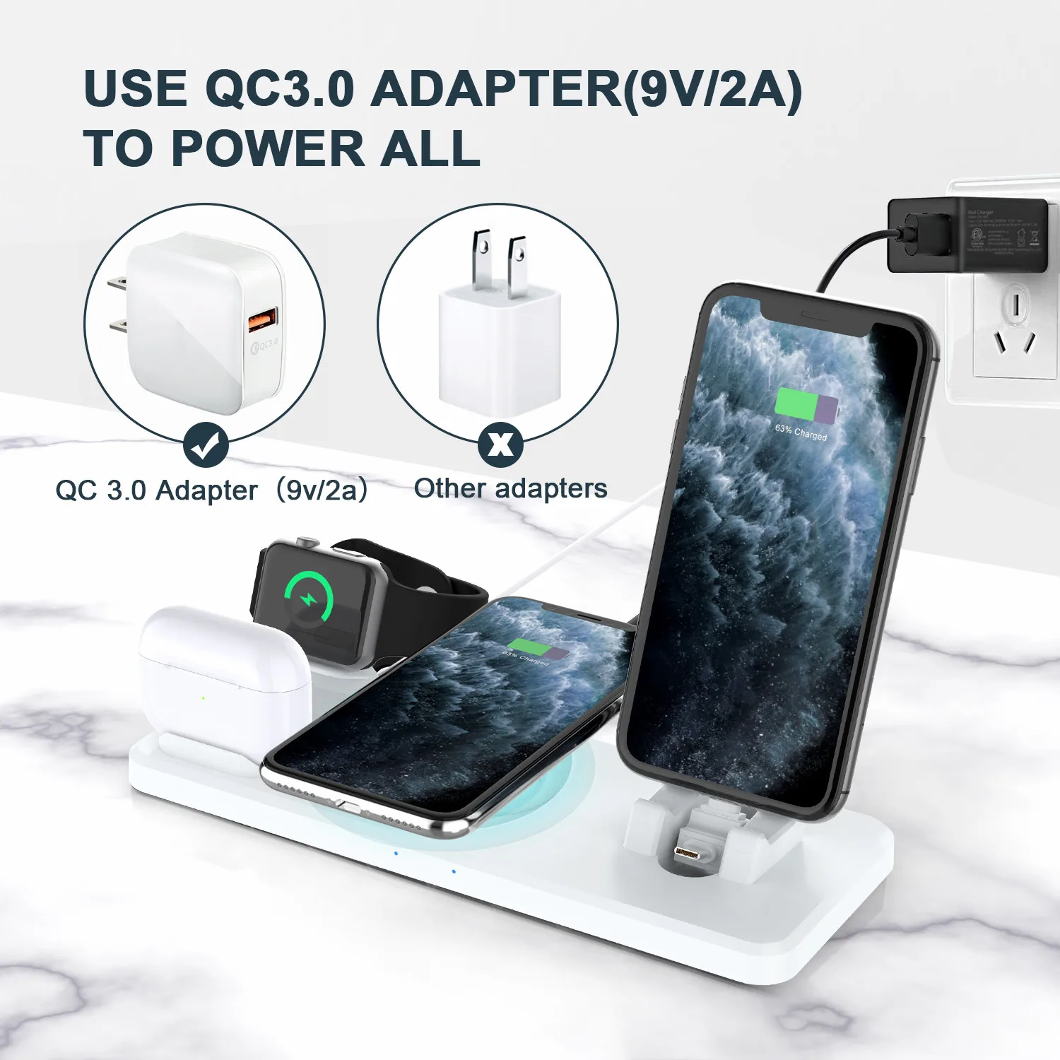 1*4 в 1 беспроводная зарядная станция 1 * Руководство пользователя 1 * кабель для передачи данных типа C 1 * Usb адаптер QC 3,0 (только выберите с вилкой)