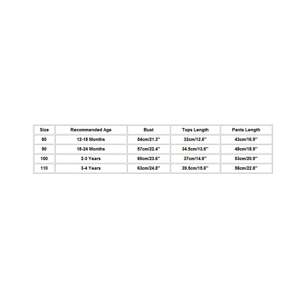 Размер Рекомендуемый возраст Обхват груди Длина топа; Длина Длина брюк 80 12-18 месяцев 54 см/21,3'' 32 см/12,6'' 43 см для ухода за ребенком для мам/16,9'' 90 18-24 месяцев 57 см/22,4'' 34,5 см/13,6'' 48 см/18,9'' 100 От 2 до 3 лет 60 см/23,6'' 37 см/14,6'' 53 см/20,9'' 110 От 3 до 4 лет 63 см/24,8'' 39,5 см/15,6'' 58 см/22,8''