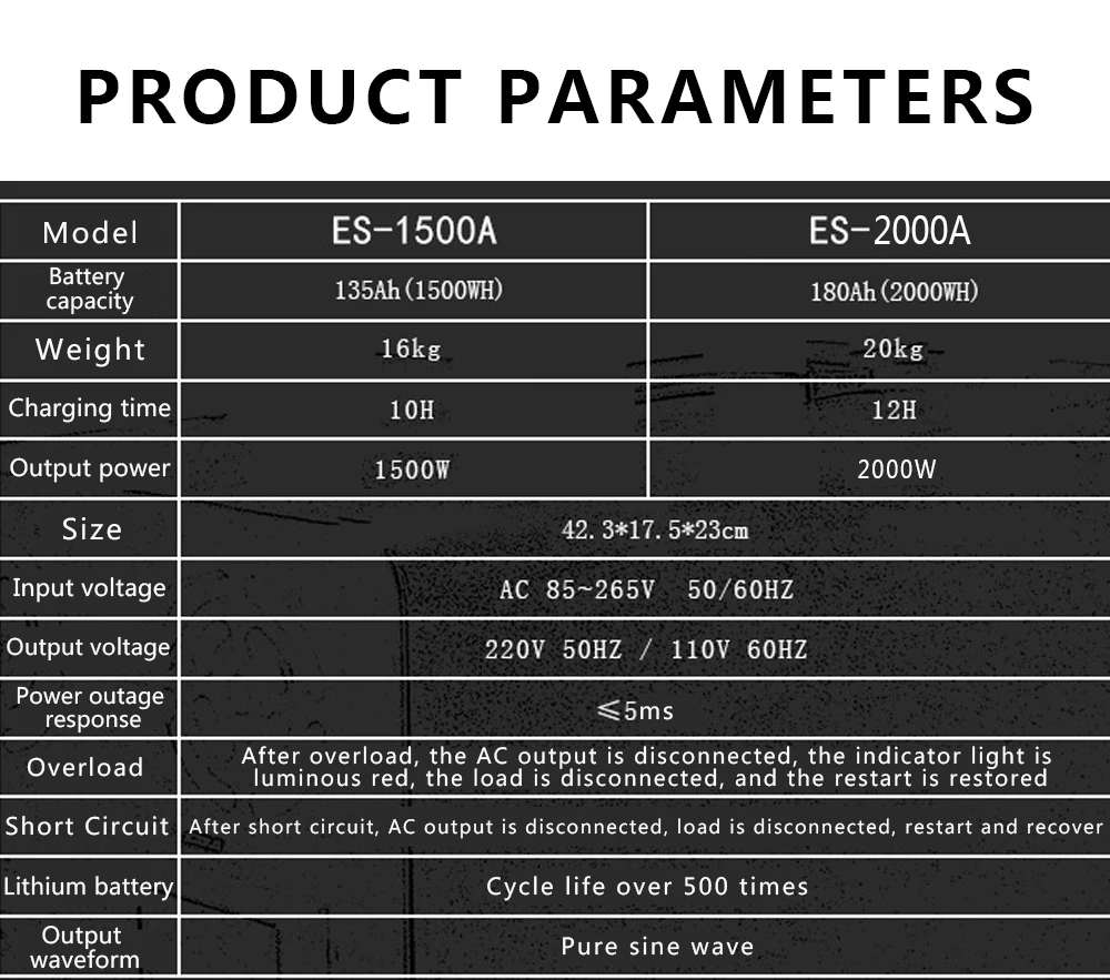 1. Питание на открытом воздухе: надежная и мощная портативная электростанция для кемпинга, охоты или рыбалки. Не требуется техническое обслуживание. Нет газа. Без остатка. 2. Большой источник питания может удовлетворить все ваши потребности: Эта портативная электростанция мощностью 1500 Вт может содержать литиевую батарею мощностью 1500wh, которая может легко заряжать дроны, цифровые камеры, планшеты и Персональные медицинские устройства. 3. Солнечный генератор для отдыха на открытом воздухе Возьмите легкий генератор SKU000304(1500 Вт) с собой на кемпинг, путешествия, дачные поездки, внедорожные, экскурсионные или в любом месте, где вам может понадобиться питание. Будьте в жизни вечерние на заднем дворе барбекю или задние ворота 4. Домашний резервный источник питания Когда вам нужна мощность в аварийной ситуации или во время отключения питания, SKU000304(1500 Вт) может быть вашим надежным резервным источником питания для освещения, телефонов, ноутбуков, CPAP машин, радиоприемников и т. д. Вы также можете использовать его для подзарядки аккумуляторов в фонариках и других устройствах, не боясь быть в темноте.