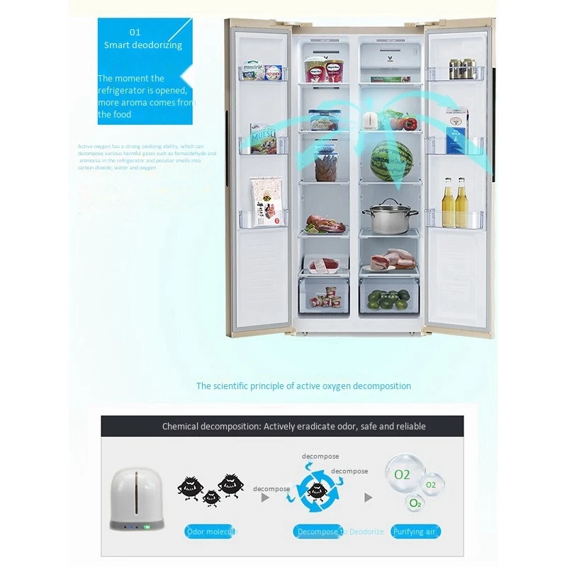 1. Активный кислород обладает сильной окислительной способностью, которая может разложить формальдегид, аммиак и другие вредные газы и запах в холодильнике на углекислый газ, воду и кислород.