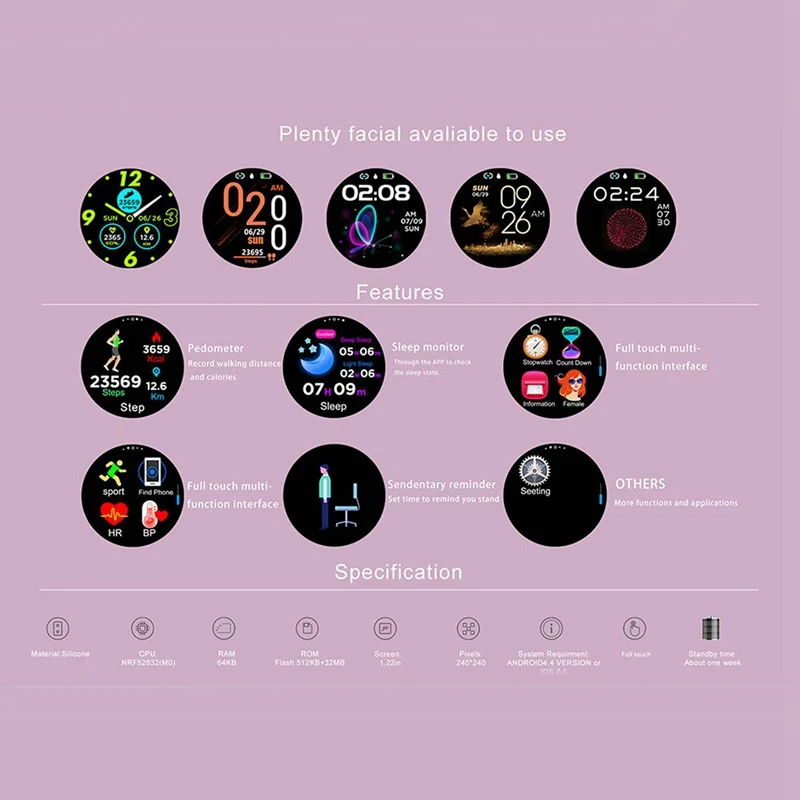 Другие функции: выбор циферблата, мультиспортивный режим, флип-он sn, отображение погоды, отображение времени, удаленное фото, поиск браслета, акция WeChat, напоминание о звонках, поддержка обновления воздуха в приложении