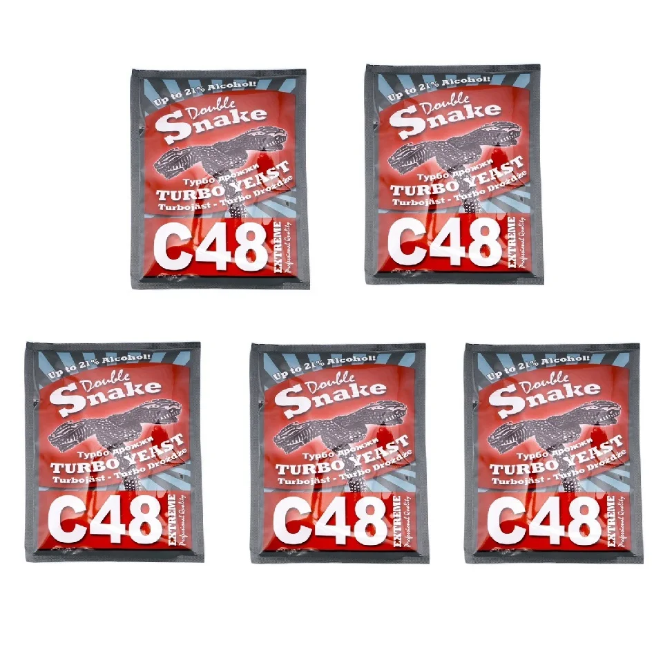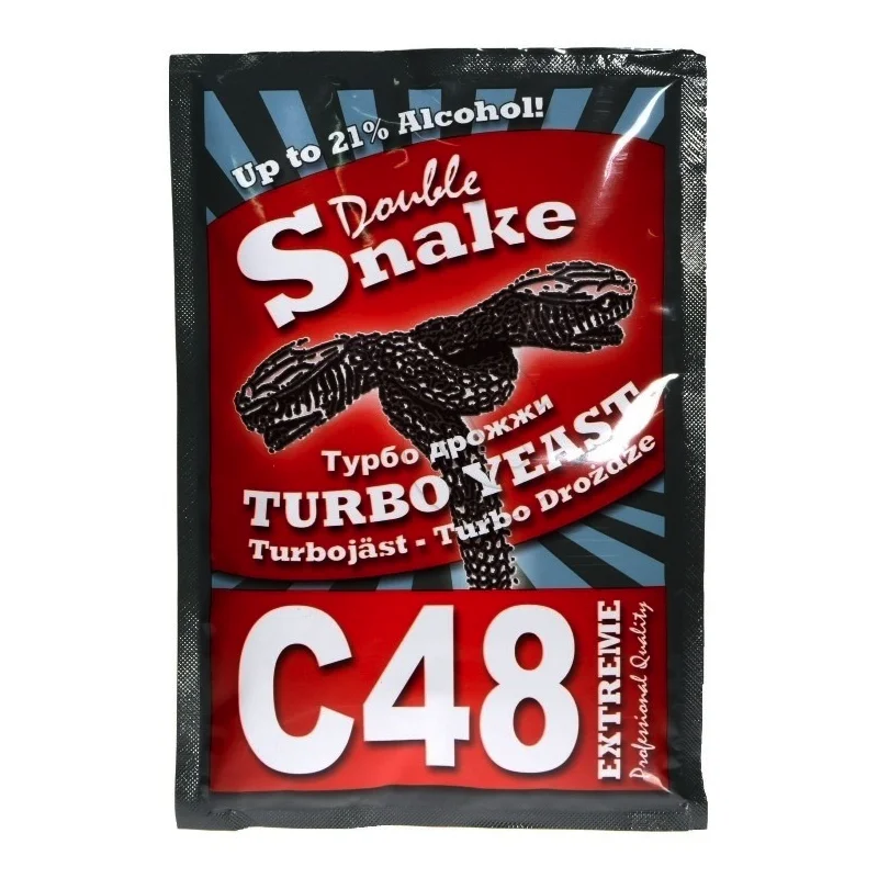 "DoubleSnake "C48- оригинальные турбо-дрожжи, являющиеся одними из самых стойких и мощных штаммов спиртовых дрожжей. Специальная смесь дрожжей, витаминов и микроэлементов способна сбраживать до 9 кг сахара на 26 л до 21% алк. За 4-5 дней.