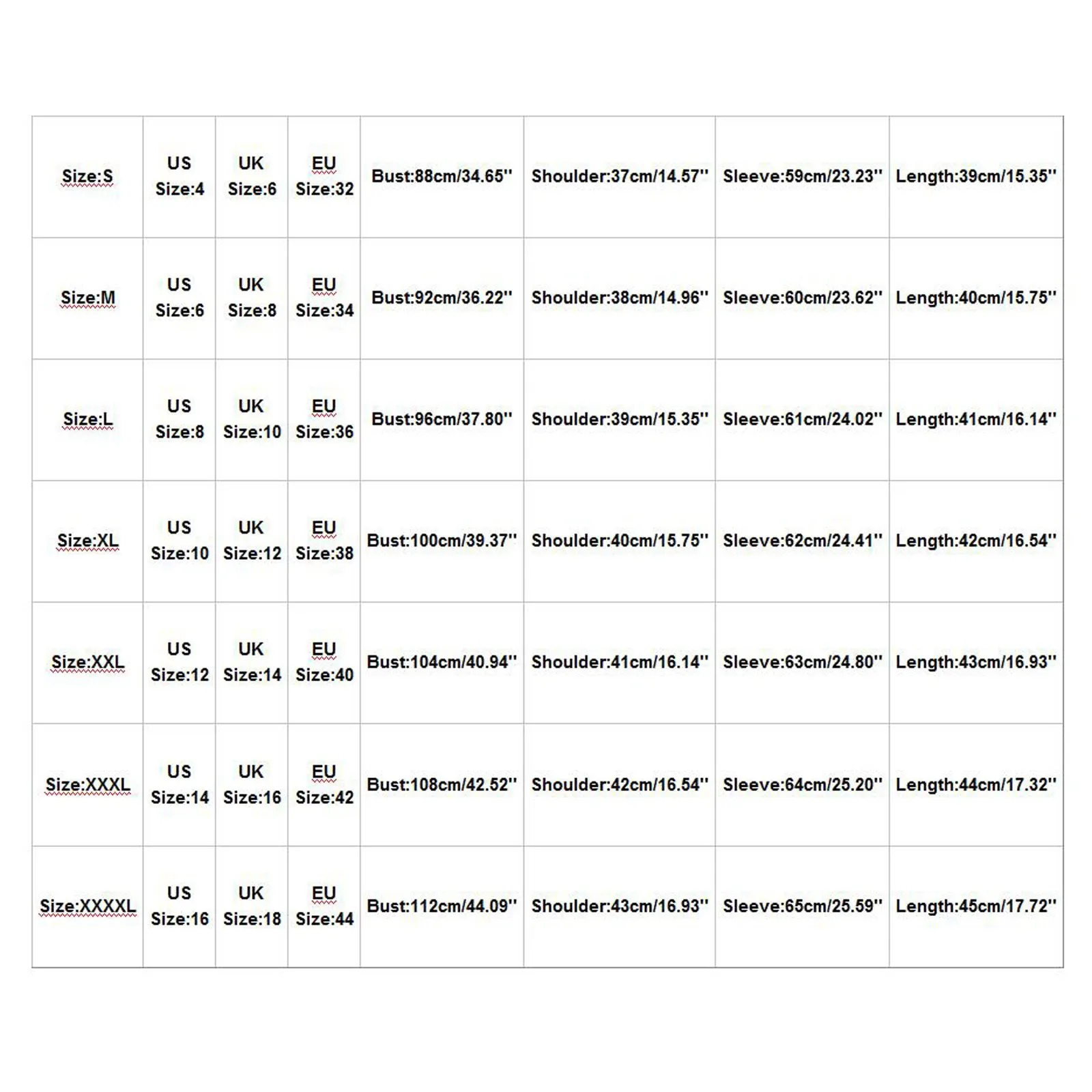 Размеры Нам Размеры UK Размеры ЕС Размеры Обхват груди Сумка на плечо Рукава Длина S 4 6 32 88 см/34,65'' 37 см/14,57'' 59 см/23,23'' 39 см/15,35'' М 6 8 34 92 см/36,22'' 38 см/14,96'' 60 см/23,62'' 40 см/15,75'' L 8 10 36 96 см/37,80'' 39 см/15,35'' 61 см/24,02'' 41 см/16,14'' XL 10 12 38 100 см/39,37'' 40 см/15,75'' 62 см/24,41'' 42 см/16,54'' XXL 12 14 40 104 см/40,94'' 41 см/16,14'' 63 см/24,80'' 43 см для ухода за ребенком для мам/16,93'' XХХL 14 16 42 108 см/42,52'' 42 см/16,54'' Высота голенища 64 см; 25,20'' 44 см/17,32'' XXXXL 16 18 44 112 см/44,09'' 43 см для ухода за ребенком для мам/16,93'' 65 см/25,59'' 45 см/17,72''