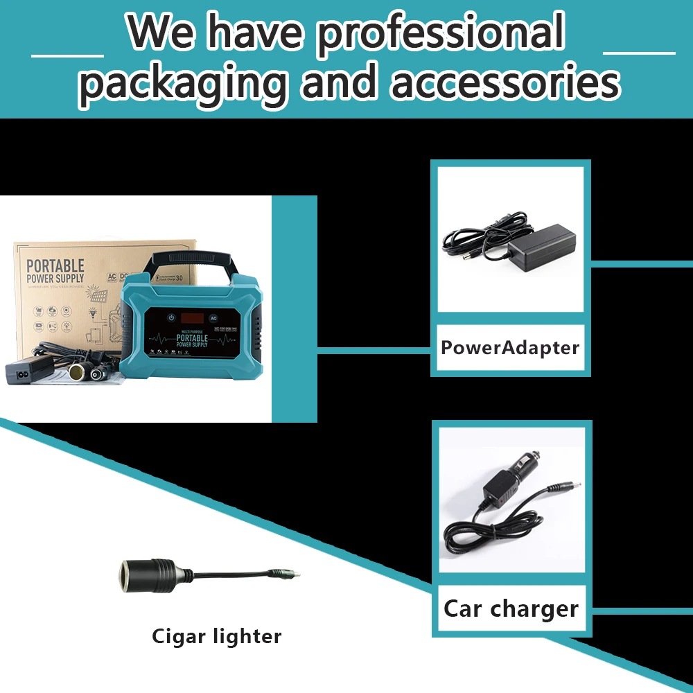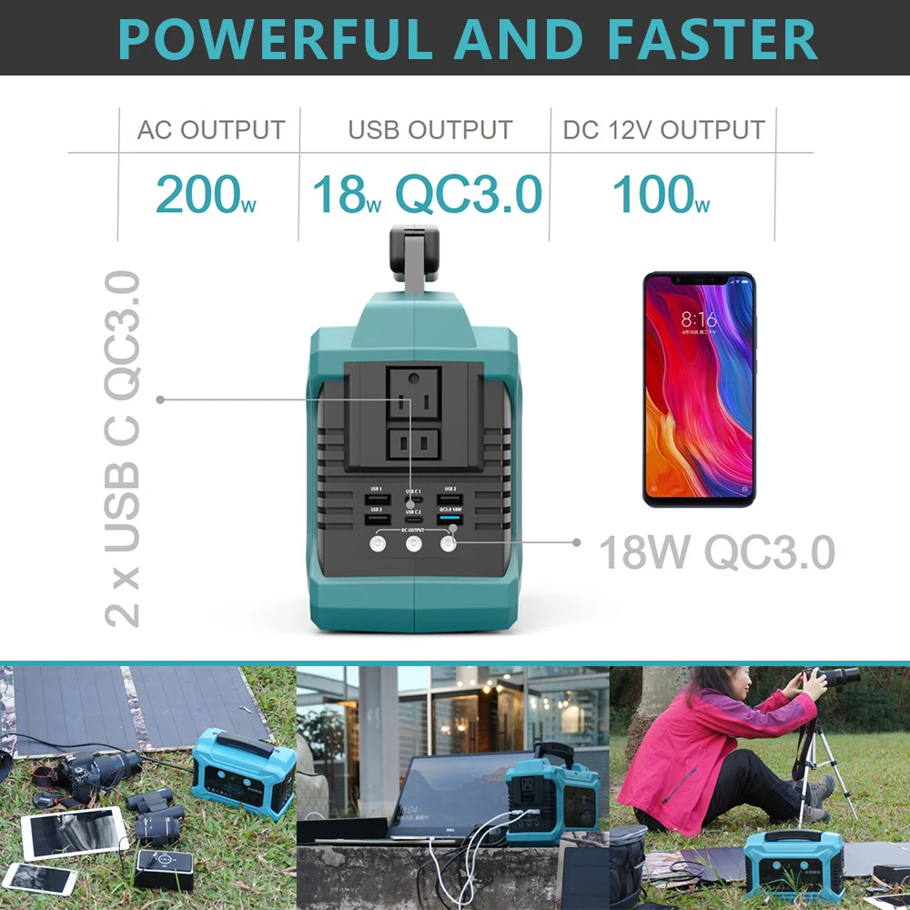 1. Встроенный литий-полимерный аккумулятор высокой мощности 2. Мощность аккумулятора до 200Wh 3. Быстро заряжается от входной заряд 15V/3A, полного заряда постоянного тока: 8 часов 4. Непрерывный выход до 200 Вт переменного тока 5. Выходы постоянного тока, мощность до 200 Вт для автомобильных комплектов, ламп, вентиляторов и т. Д., 6. Поддержка 5 usb-выходов, быстрая зарядка для умных устройств. 7. Защита включает: A. Защита от короткого замыкания B. Защита от перегрузки по току C. Защита от перенапряжения D. Защита от низкого напряжения E. Защита от перегрузки F. Защита от перегрева 8. Встроенный фонарик высокой яркости