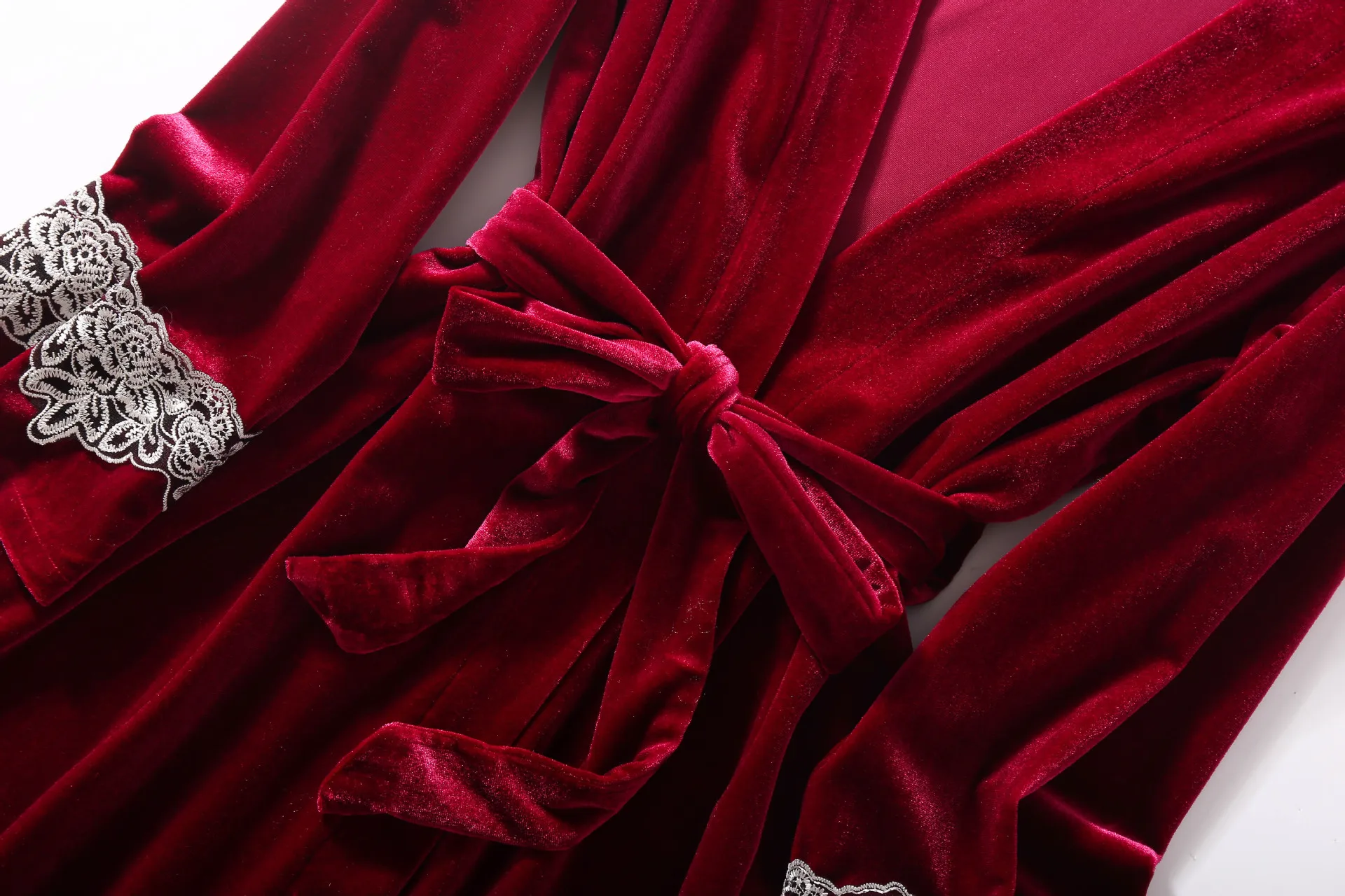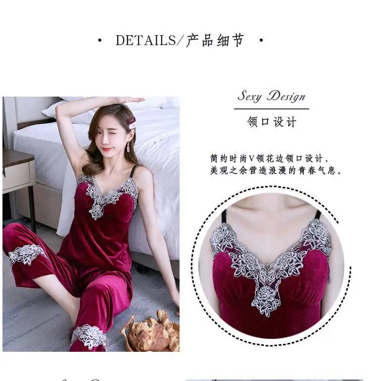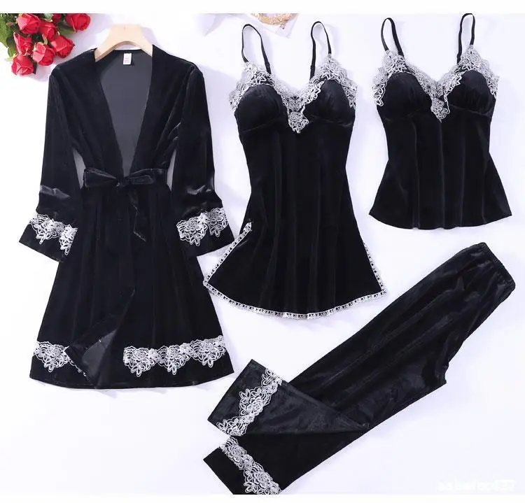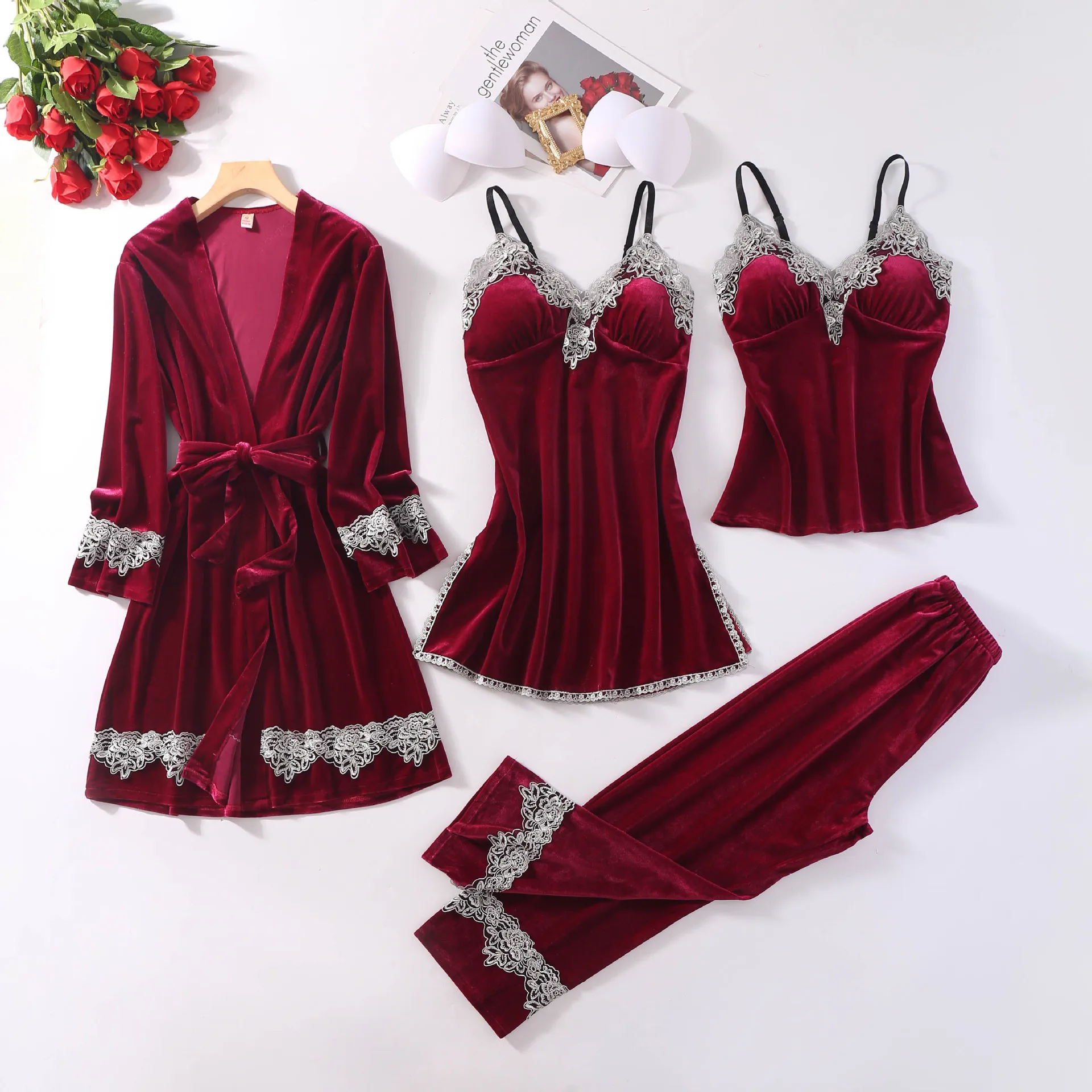 Пижама женская весенне-осенняя Золотая Бархатная ночная рубашка с длинными рукавами, можно носить из трех предметов, пикантная зимняя кружевная Домашняя одежда с нагрудным подкладом