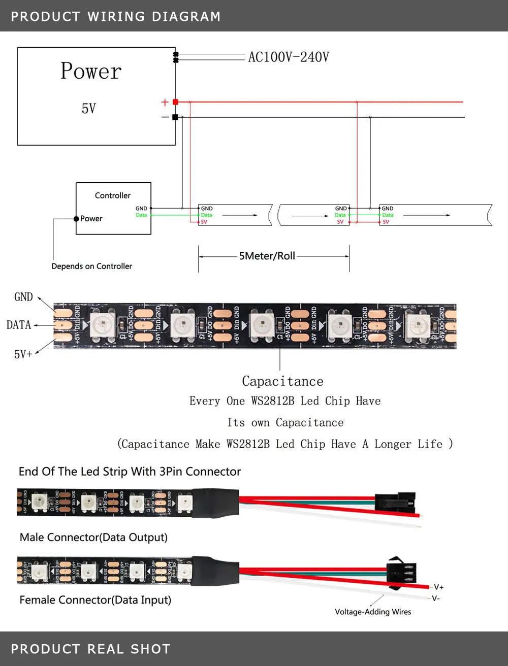 Обратите внимание1. Светодиодная лента с помощью контактной сварки 0,5 м, это совершенно нормально в электронного продукта, это не является проблемой качества. В том случае, если вы имеете что-то против, не Оформляйте заказ!2. WS2812B Светодиодные полосы можно вырезать купить каждый "один" светодиодный чип!3. IP30: не водонепроницаемыйIP65: водонепроницаемое силиконовое покрытиеIP67: водонепроницаемый в силиконовой трубке4. WS2812B Светодиодная лента работает с DC5V, и ей должен быть нужен WS2812B светодиодный контроллер управленияЕсли заказ не превышает 5 долларов США, номер отслеживания отсутствует!О том, как выбрать светодиодную мощностьРассчитывается вся Светодиодная лента Ватт:1. Один светодиодный чип составляет около 0,3 Вт, если вы покупаете 5 м 30 светодиодов/м (общая Светодиодная лента 150 светодиодов), таким образом, 0,3 W * 150 = 45 Вт2. И эта Светодиодная лента работает 5 В, поэтому 45 Вт/5 В = 9A, мы знаем, что эта Светодиодная лента лучше, по крайней мере 9A...Дешифрование продукта:1. Светодиодная лента WS2812B питается от "5 В питания" (не входит в комплект) и управляется одной линией передачи данных от подходящего контроллера (не входит в комплект).2. 3-контактный разъем JST разъем в комплекте: красный, защита от перегрузки: VCC лозы: GND, Зеленый: данные.3. Полоса имеет клейкую ленту 3M на задней части (за исключением Ip67). Поверхность установки должна быть гладкой, чистой и сухой.4. Светодиодная лента может быть разделена между каждым светодиодом для создания пользовательских длин.5. Не сгибайте полоску.6. Более длительные пробежки должны питаться от обоих концов, чтобы уменьшить падение напряжения.7. 3-контактный разъем JST разъем провод 20AWG.Применение продукции:WS2812B цветные полоски мечты используется для TV Hotel, K TV, Bar, игровой комнаты и другого отдыха, украшение для развлечений, чтобы повысить атмосферу, шасси автомобиля, украшение автомобиля, украшение магазина, украшение дома и другие украшения.Информация о продукте:Входное напряжение: DC5VМощность: 30 светодиодов/м ---- 9 Вт/метр60 светодиодов/м ---- 18 ватт/метр74 светодиода/м ---- 22,2 Ватт/метр144 светодиодов/м ---- 43,2 Вт/метрСветодиодный ресурс: WS2812B светодиодный (5050 SMD RGB светодиодный со встроенной улучшенной версией WS2811 IC)Светодиодный: Каждый светодиодный отдельно управляемый светодиодныйТип IC: улучшенная версия WS2812 IC (Встроенный светодиодный индикатор 5050SMD RGB)ИС: 1 IC дисков 1 Led чипПиксели: 30/60/74/144/метровШаг: 16,6 мм (1000/64)Серые Весы: 256Биты/Цвет: 8 бит/цветFPC ширина: 30 светодиодов/м ---- 10 мм60 светодиодов/м ---- 10 мм74Led/m --- 10 мм144 светодиодов/м ---- 12 ммЦвет FPC: черный/белыйСтепень защиты: IP30/ IP65 /IP67Цвет s: полный цвет RGB, изменение цвета мечтыМожно резать: Каждый светодиодныйПосылка: в антистатическую сумку, IP30 IP65 с 3 м липкой лентой на задней части (IP67 без 3M клей)Посылка включает:1 м/2 м/3 м WS2812B Светодиодная лента