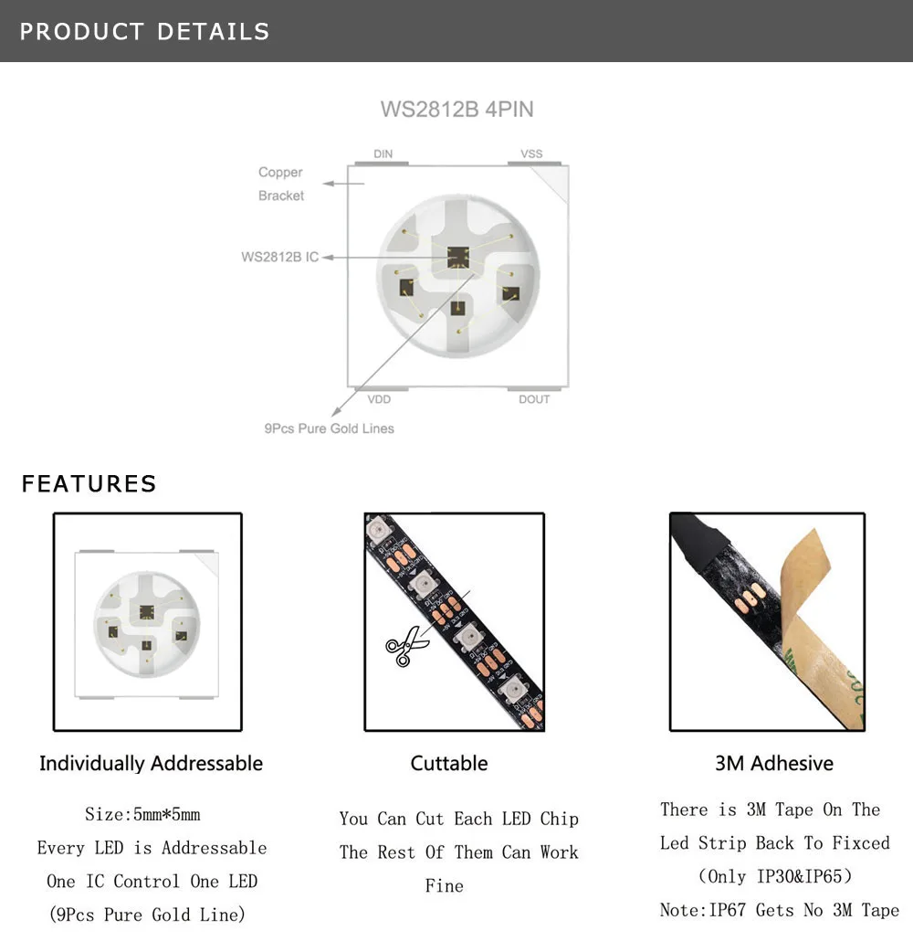 Описание продукта:1. Светодиодная лента WS2812B питается от"Источник питания 5 В"(Не входит в комплект) и контролируетсяОдна линия передачи данных от подходящего контроллера(Не входит в комплект).2. В комплект входит 3-контактный разъем JST: Красный: VCC, белый: GND, Зеленый: данные.3. Полоса имеет клейкую ленту 3M на обратной стороне (EXcept Ip67). Поверхность установки должна быть гладкой, чистой и сухой.4. Светодиодную ленту можно разрезать между каждым светодиодом для создания нестандартной длины.5. Не сгибайте полоску резко.6. Для снижения падения напряжения с обоих концов следует питаться от более длительных пробежек.7. 3-контактный провод разъема JST-20AWG.Применение продукции:Цветные полосы WS2812B Dream используется для TV Hotel, K TV, Bar, Game Room и другие для досуга, украшение для развлечений для повышения атмосферы, шасси автомобиля, украшения автомобиля, украшения магазина, украшения дома и других украшений.Информация о товаре:Входное напряжение: 5 В постоянного токаМощность: 30 светодиодов/м ---- 9 Вт/метр60 светодиодов/м ---- 18 Вт/метр74 светодиода/м ---- 22,2 Вт/метр96 светодиодов/м ---- 28,8 Вт/метр144 светодиодов/м ---- 43,2 Вт/метрРесурс светодиодный да: WS2812B светодиодный 5050 SMD RGB со встроенной улучшенной версией микросхемы WS2811)Светодиодный ОД: каждый светодиод управляется светодиодный льноТип IC: улучшенная версия WS2812 IC (встроенный светодиод 5050SMD RGB)IC: 1 IC дисков 1 светодиодный чипПиксели: 30/60/74/96/144/метровШаг: 16,6 мм (1000/64)Серая шкала: 256Биты/Цвет: 8 бит/цветШирина FPC: 30 светодиодов/м ---- 10 мм60 светодиодов/м ---- 10 мм74 светодиода/м --- 10 мм96 светодиодов/м --- 10 мм144 светодиодов/м ---- 12 ммЦвет FPC: черный/белыйСтепень защиты: IP30/ IP65 /IP67Цвет s: полноцветный RGB, смена цвета мечтыРезка: Каждый светодиодный режетсяПосылка: в антистатическом пакете, IP30 IP65 с клейкой лентой 3M на задней части (IP67 без клейкой ленты 3M)Посылка:Светодиодная лента WS2812B 1m/2m/3m/4m/5mОчень крутые джинсы, отлично сидят на фигурке, лично мне импонирует защитный окрас, ткань не тонкая, достаточно плотная, но при этом... Читать отзыв полностью...