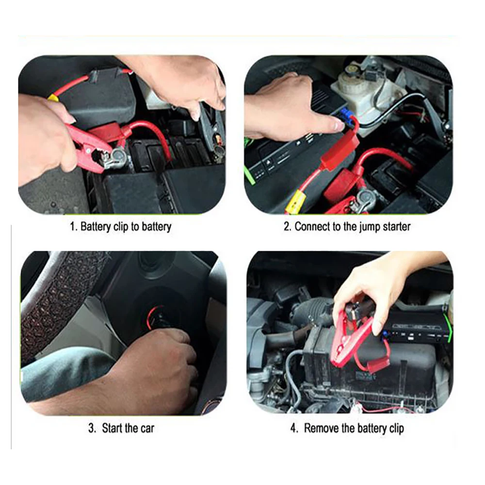 ◆Подключите зажим стартера к аккумулятору ◆Connect к Пусковое устройство для стартера ◆Start автомобиля ◆Remove в батарейный зажим