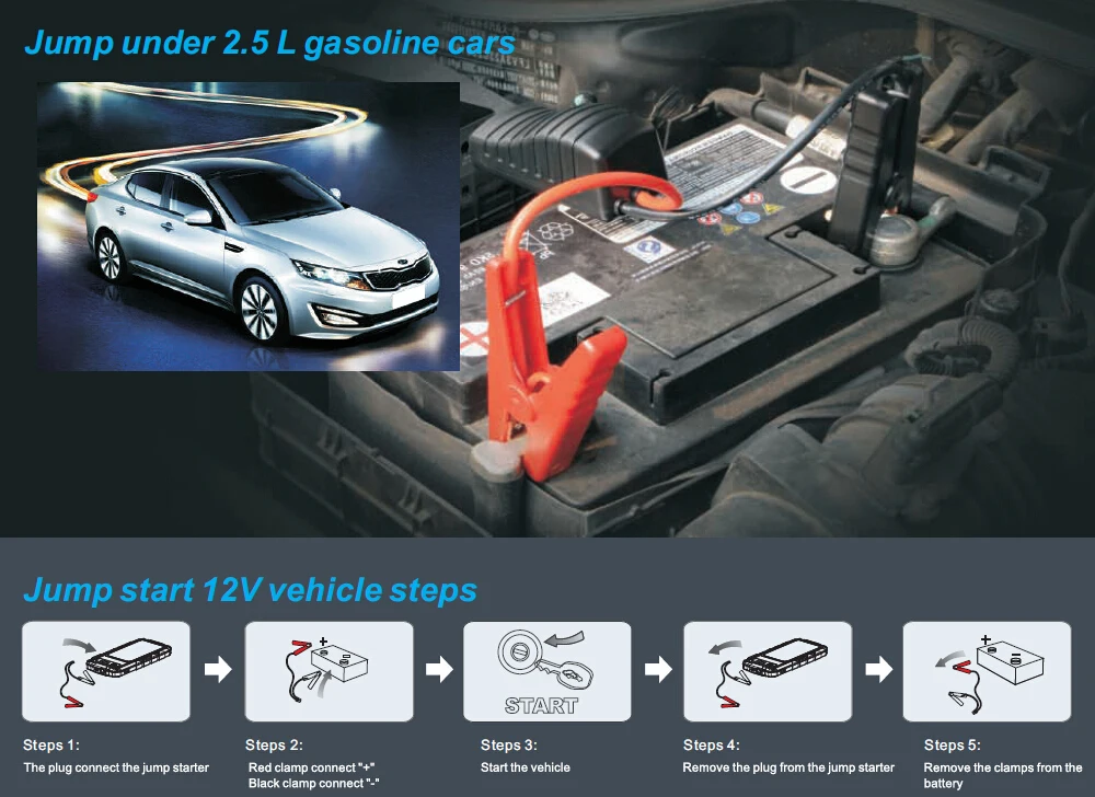 Это единственный скачок, который вам когда-либо понадобится. Он способен запускать 12 В транспортных средств. С функцией автоматического обнаружения, которая автоматически определяет напряжение батареи, он имеет пиковый ток 400A от литий-полимерного аккумулятора 7000 мАч, который способен прыгать стартовые грузовики, автобусы, 4WD's, фургоны, велосипеды, автомобили, лодки, водные лыжи, или что-то, что вы бросайте на него. Благодаря своей большой емкости литий-полимерный аккумулятор класса А, он может несколько раз запускать ваш автомобиль.