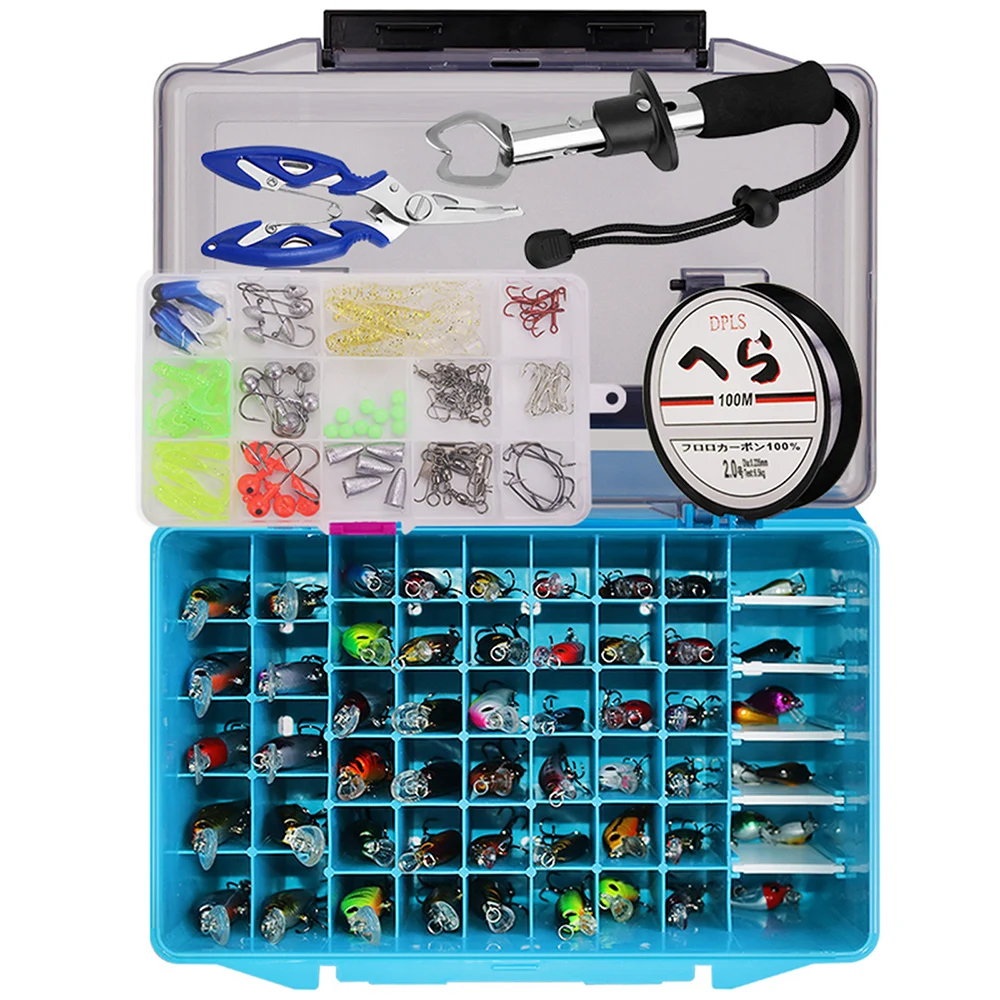 Набор рыболовных снастей 143 шт. включает в себя 56 * гольян приманки, 20 * мягкие приманки, 15 * джиг крючки, 5 * Кривошипные крючки, 10 * тройные Крючки, 10 * бусины, 5 * грузики, 20 * Вертлюги и защелки, 1*100 м нейлоновая линия, 1 * коробка аксессуаров.