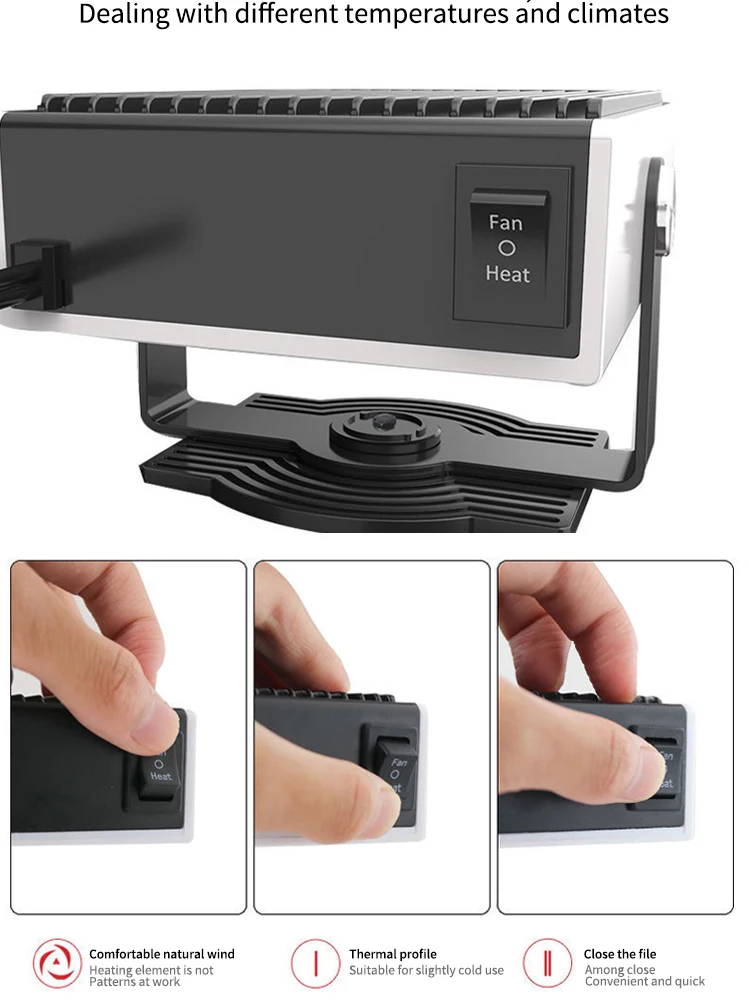 1. Бортовой обогреватель поможет вам убрать Мороз и туман внутри автомобиля, очистить теплый воздух, а также сделать вождение более безопасным и легким зимой; 2, а именно открытый а именно тепло, тепло равномерное; Свободная Регулировка вращения режима нагрева и охлаждения; 3, вращение на 360 градусов, вы можете указать теплый воздух в нужное вам место, следите за своим сердцем; 4, стабильная защита тока, термостойкий материал ABS, нетоксичный и безвредный, долговечный; 5, могут использоваться Автомобили 12В;