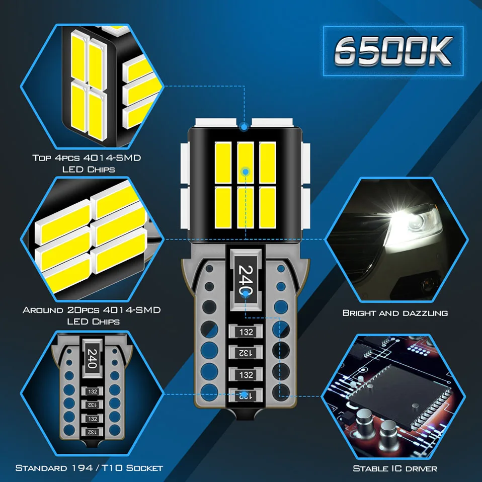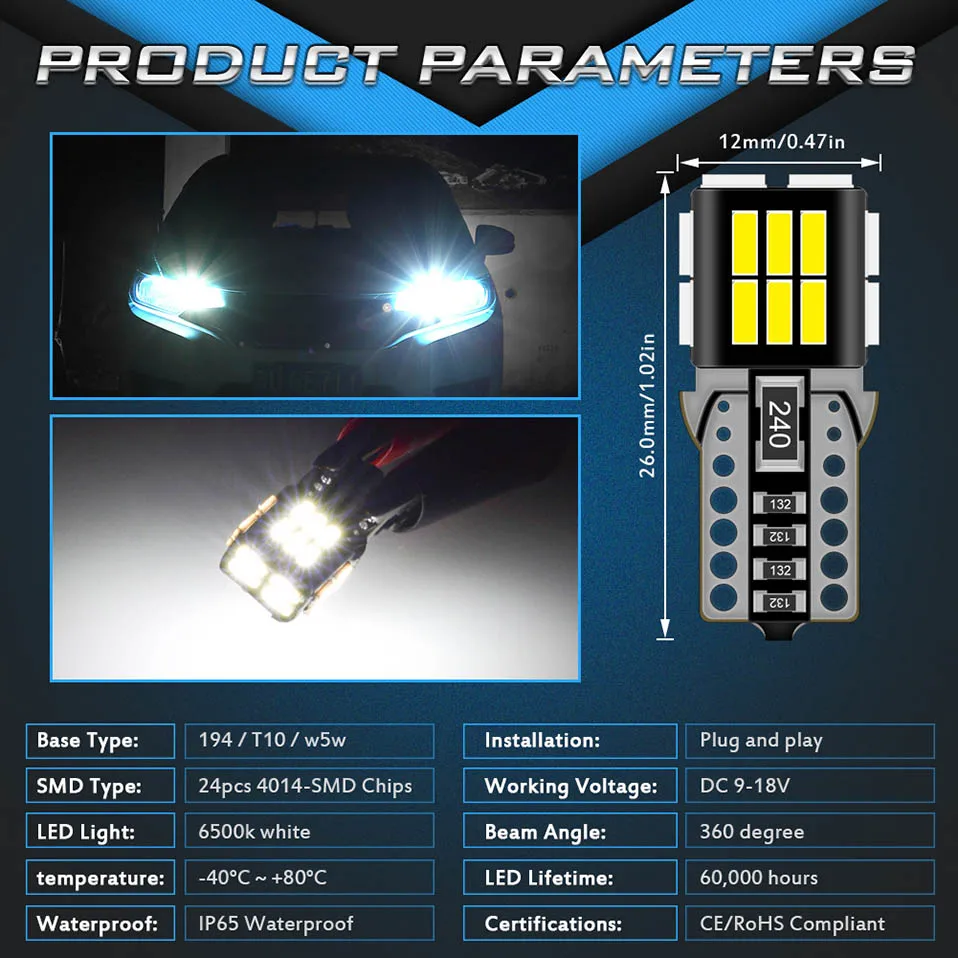 Base Type: T10 W5W 194 168 led Canbus bulbs LED Type: 24SMD 3014 Chips Operating Voltage: 12-16V Color:Amber/White/Icebule/Red Power: 3.5W