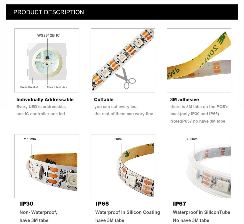 WS2812Особенности:Напряжение: 5 В постоянного токаРесурс светодиодный: WS2812B светодиодный Встроенная улучшенная версия WS2811 IC)Тип ИС: улучшенная версия WS2812 IC (встроенный светодиод 5050 RGB)Светодиодный: Каждый светодиодный отдельно управляется светодиодныйIC: (1 IC дисков 1 светодиодный чип)Разрезаемый: Каждый светодиодный можно разрезатьСерая шкала: 256Биты/Цвет: 8-биты/цветЦвет s: полноцветный RGB, меняющий цвет мечты