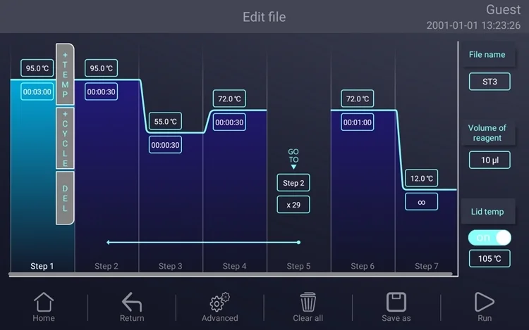1) принимает специальный модуль Пельтье для температурного циркулятора; 2). Инженерный усиленный алюминиевый модуль, обработанный технологией анодного окисления, не только сохраняет быструю теплопроводность, но и обладает достаточно коррозионной стойкостью; 3). Быстрый рост и скорость охлаждения, самый быстрый рост 7 ℃/с скорость охлаждения, экономит драгоценное время эксперимента; 4) Адаптивное давление стержня типа горячей крышки, закрыть и закрыть крышку в один шаг, может адаптироваться к различной высоте пробирки; 5) вперед и назад воздуховоды, машина может быть размещена бок о бок; 6) с помощью android операционная система одинаковая верхняя одежда для мамы, 10,1 дюймов емкостный сенсорный экран, графическое меню-Тип интерфейса навигации, чрезвычайно простое управление; 7). Встроенный 11 стандартных шаблонов файлов программы, может быстро редактировать необходимые файлы; 8). Пользователи могут настроить 9 Кнопок быстрого доступа на домашней странице в соответствии с их потребностями; 9). Отображение в реальном времени прогресса программы и оставшегося времени, поддержка промежуточного программирования PCR инструмента; 10). Быстрая инкубация одной кнопкой для удовлетворения потребностей денатурации, пищеварения ферментов/лигирования ферментов, ELISA и других экспериментов; 11). Температура горячей крышки и режим работы могут быть установлены для удовлетворения различных экспериментальных требований; 12) автоматическая защита от отключения питания. После восстановления мощности, незавершенный цикл будет автоматически выполнен для обеспечения безопасной работы всего процесса усиления; 13). USB интерфейс, поддержка U инвентаризации/PCR данных, или использовать USB мышь для управления PCR инструмента; 14). Поддержка u-диска и программного обеспечения обновления локальной сети; 15). Встроенный WIFI модуль позволяет одному компьютеру или мобильный телефон управлять несколькими устройствами PCR одновременно через сетевое соединение; 16). Поддержка функции отправки напоминаний по электронной почте после окончания экспериментальной программы.