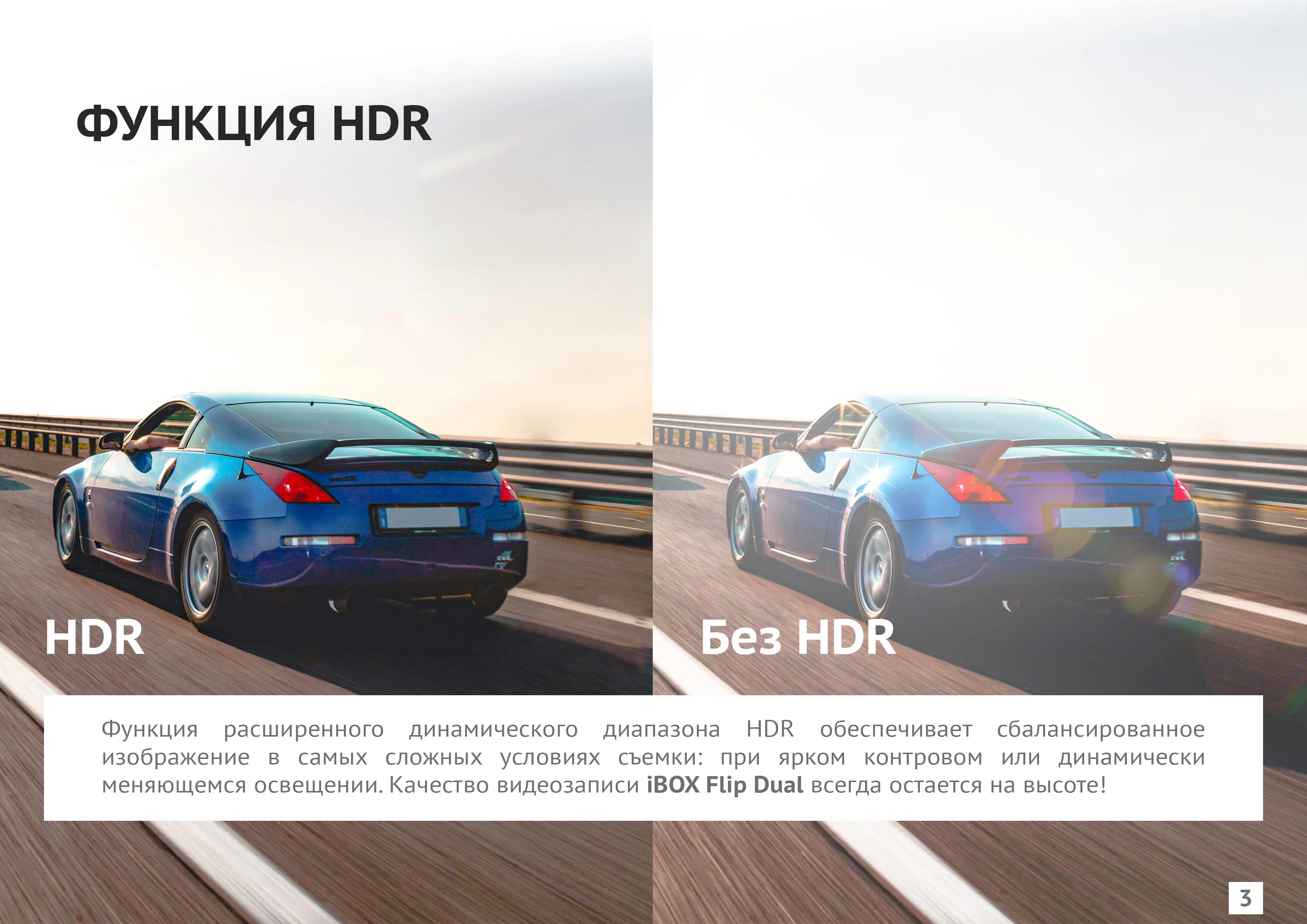 Для баланса контрастности кадра в сложных условиях в видеорегистраторе реализована автоматическая функция расширенного динамического диапазона HDR.