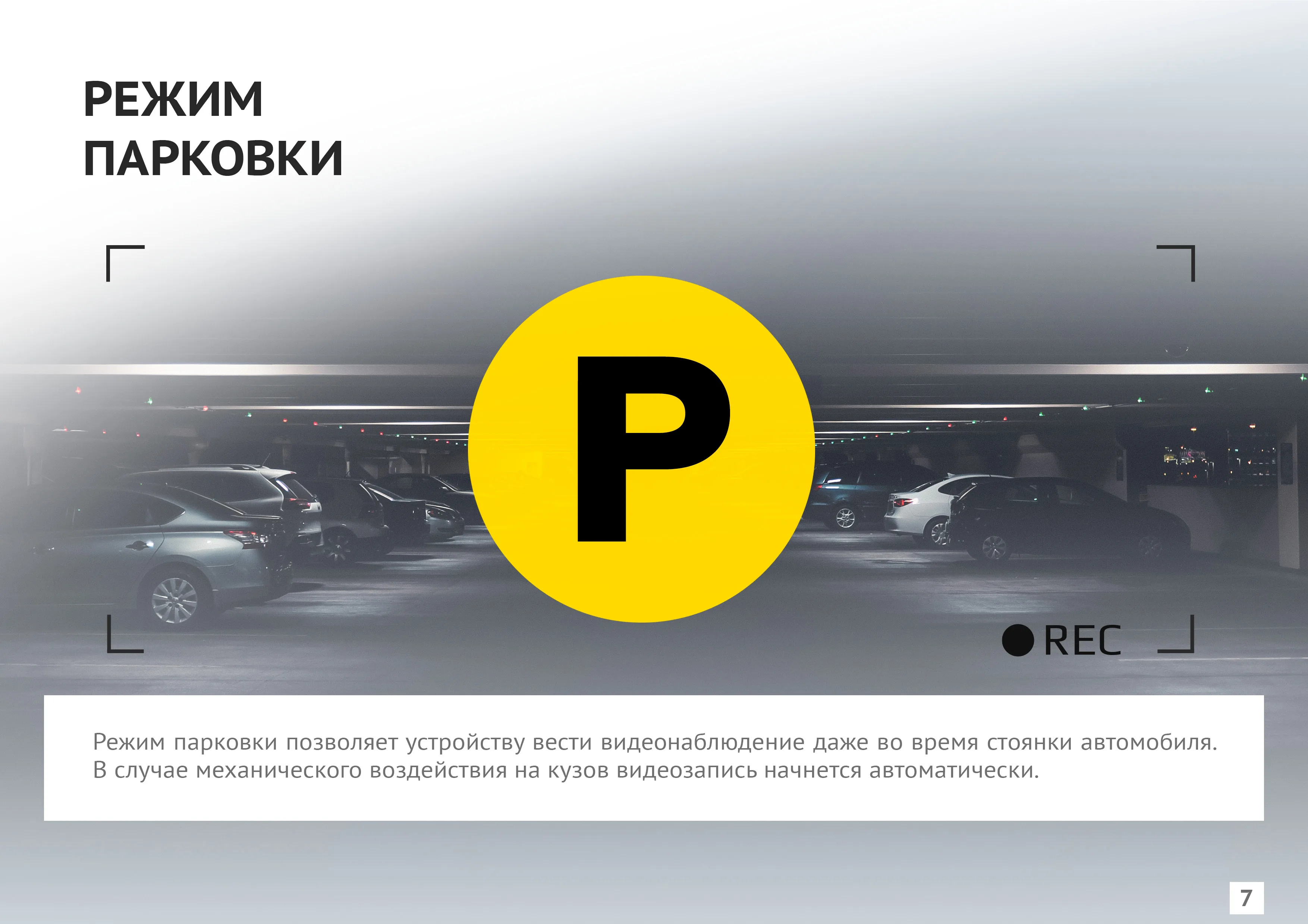 Функция Режим Парковки позволит регистратору вести видеонаблюдение даже во время стоянки автомобиля. В случае механического воздействия на кузов автомобиля видеозапись начнется автоматически.