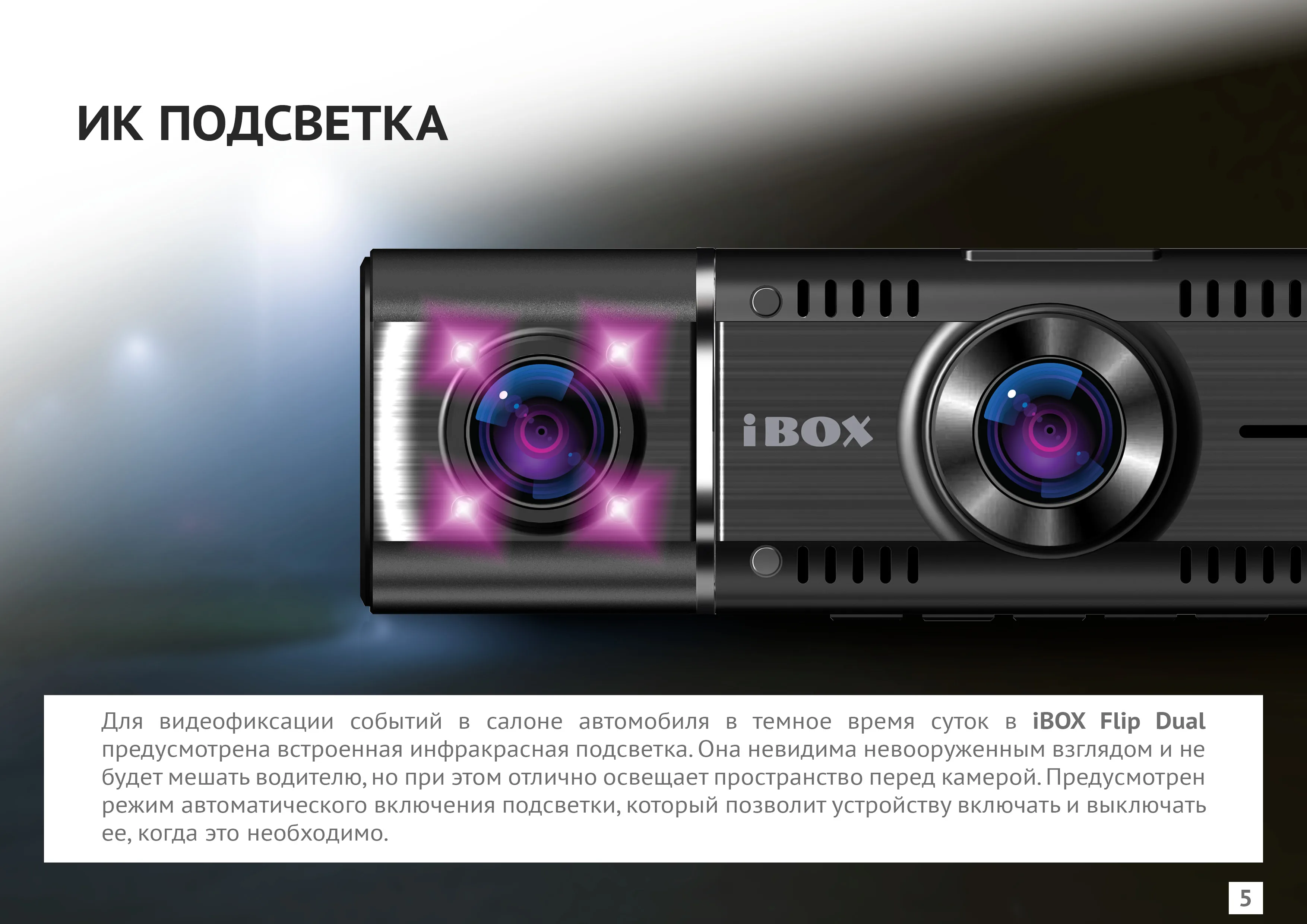 Для видеофиксации событий в салоне автомобиля в темное время суток в iBOXFlipDual предусмотрена встроенная инфракрасная подсветка. Она невидима невооруженным взглядом и не будет мешать водителю, но при этом отлично освещает пространство перед камерой. Предусмотрен режим автоматического включения подсветки, который позволит устройству самому включать и выключать ее, когда это необходимо.