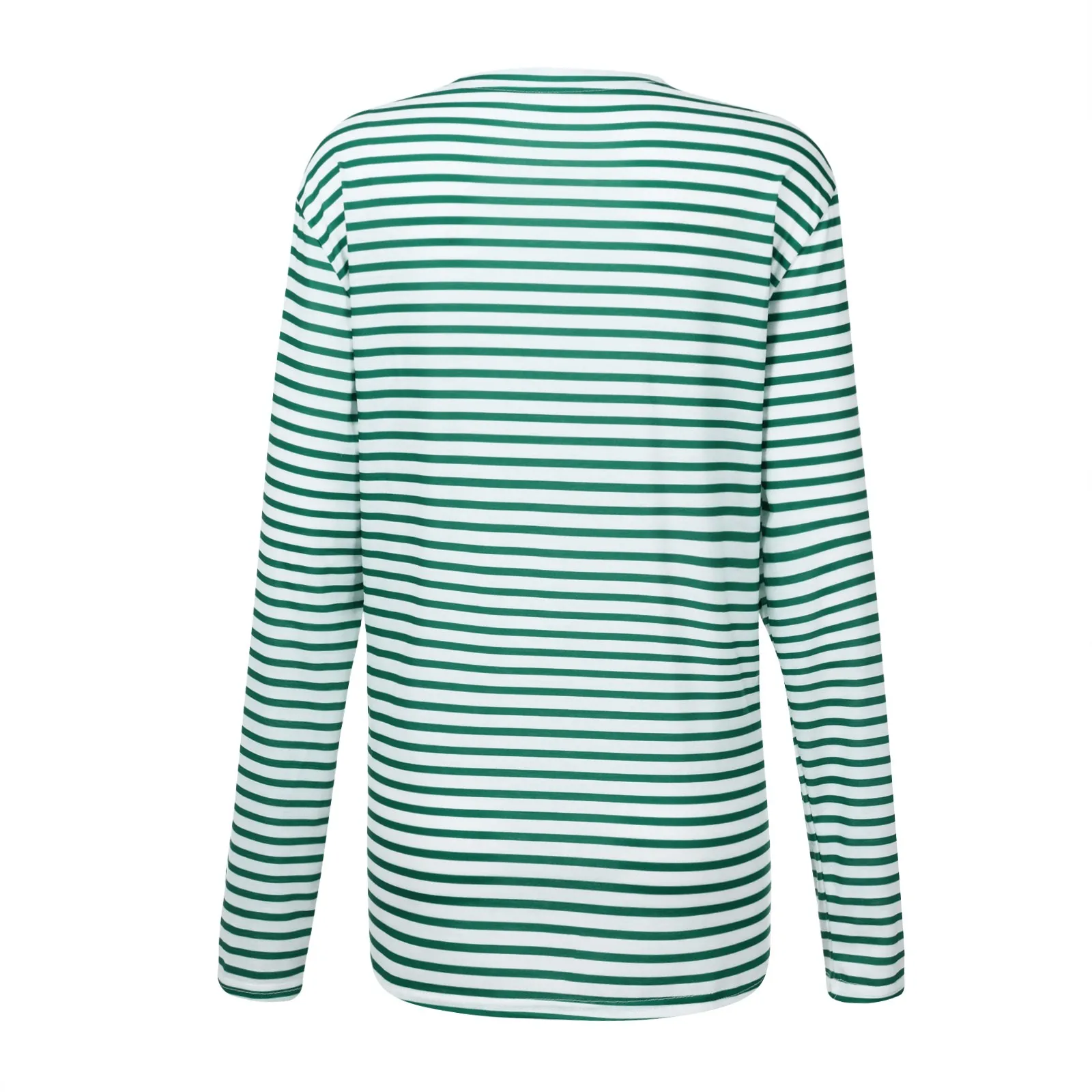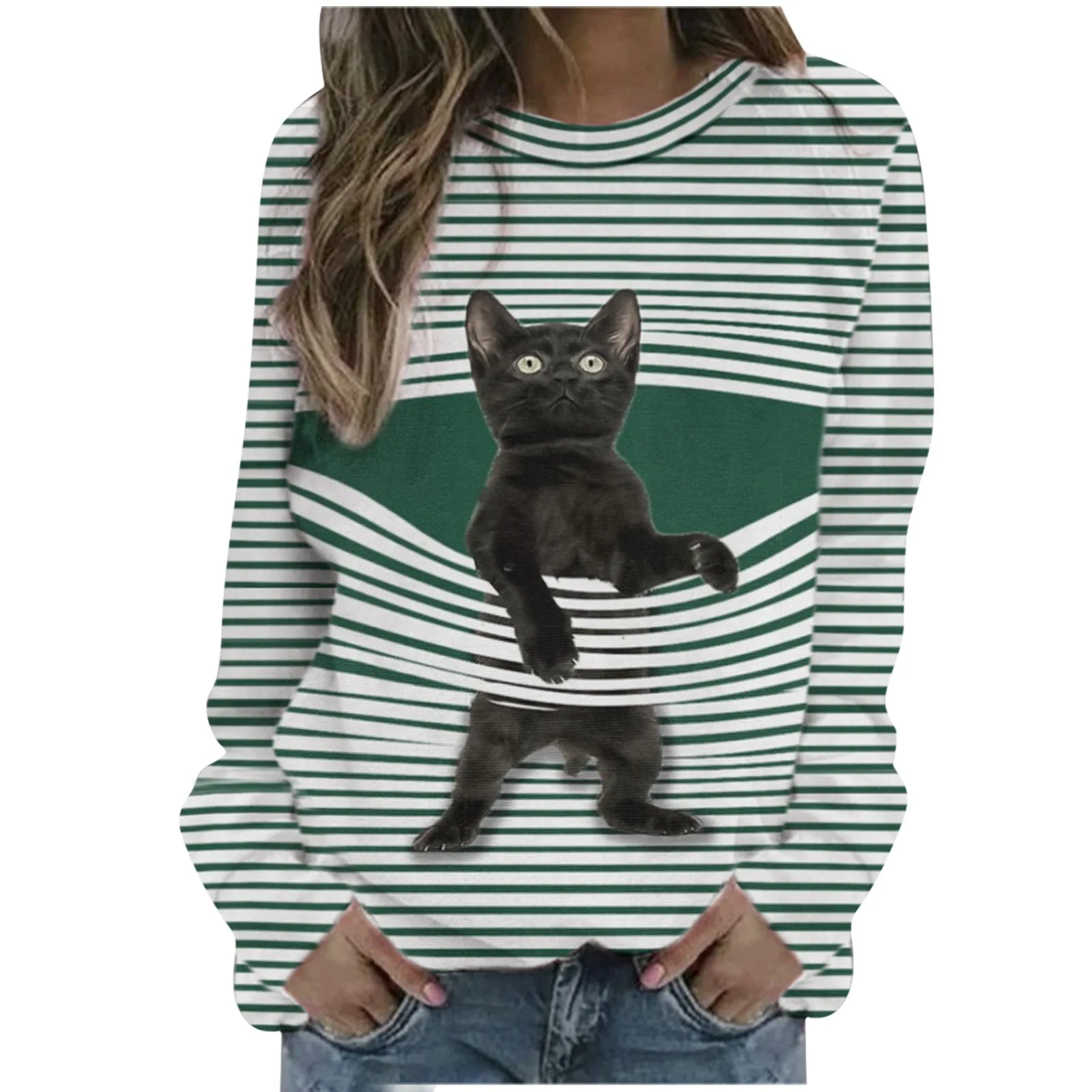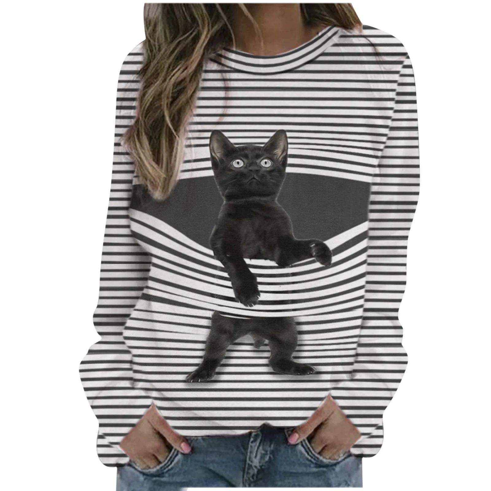 Женский Повседневный мягкий Свободный пуловер с длинными рукавами и круглым вырезом в полоску с рисунком кота