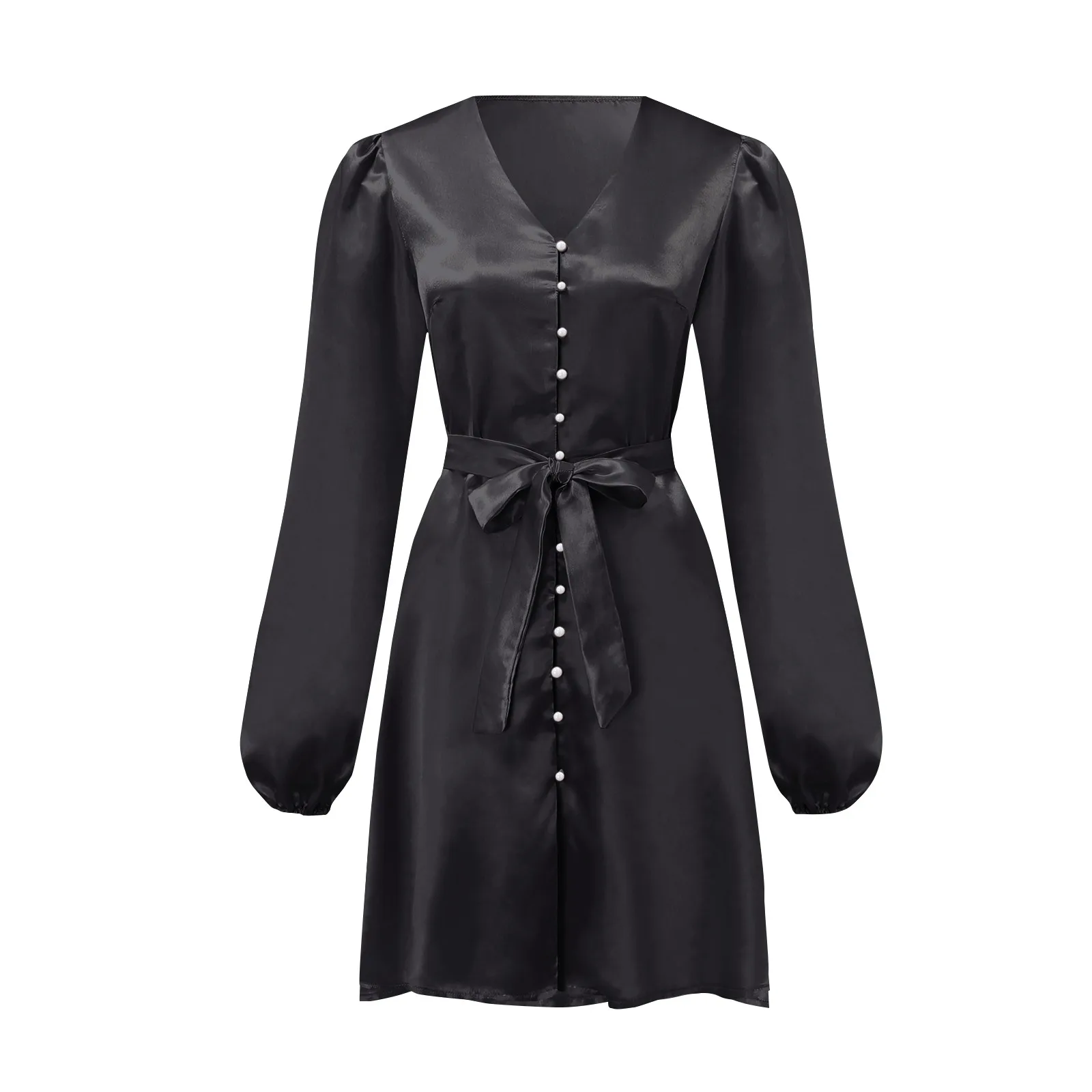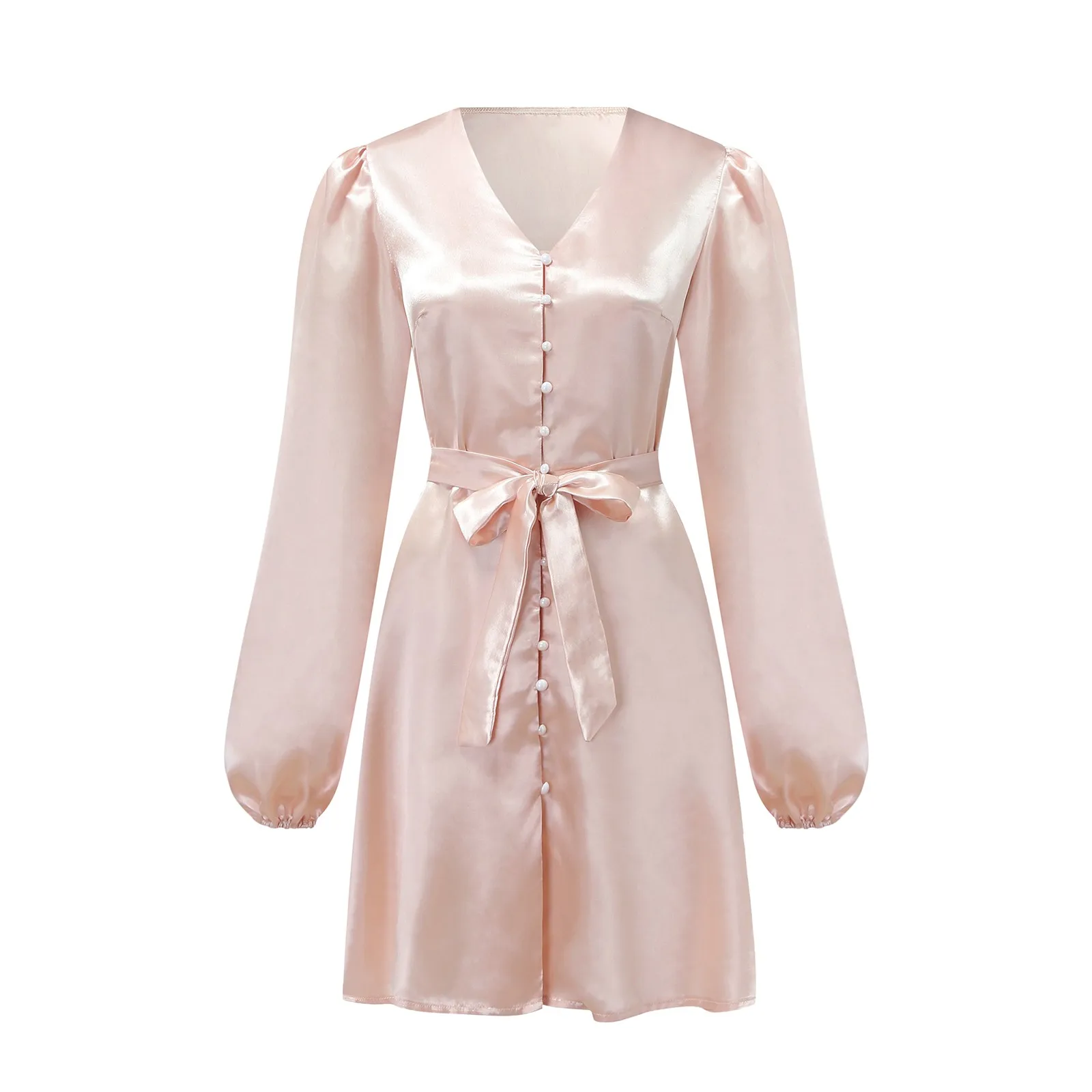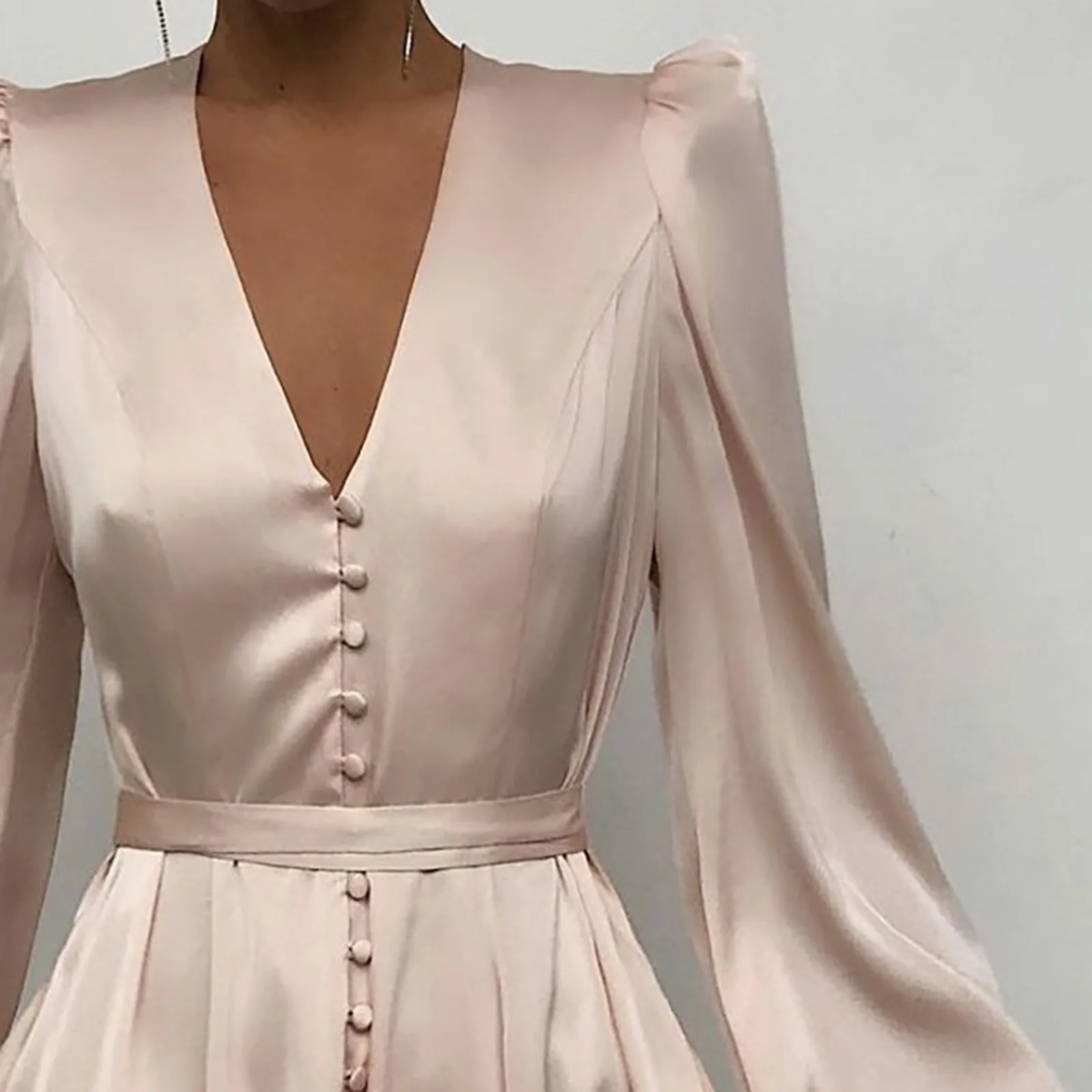 Женское платье с пышными рукавами и рюшами на пуговицах и длинным рукавом