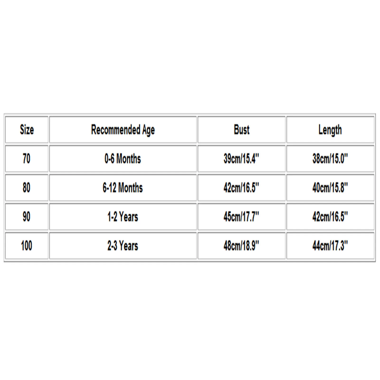 Размер Рекомендуемый возраст Бюст Длина 70 0-6 месяцев 39 см/15,4'' 38 см/15,0'' 80 6-12 месяцев 42 см/16,5'' 40 см/15,8'' 90 1-2 года 45 см/17,7'' 42 см/16,5'' 100 От 2 до 3 лет 48 см/18,9'' 44 см/17,3''