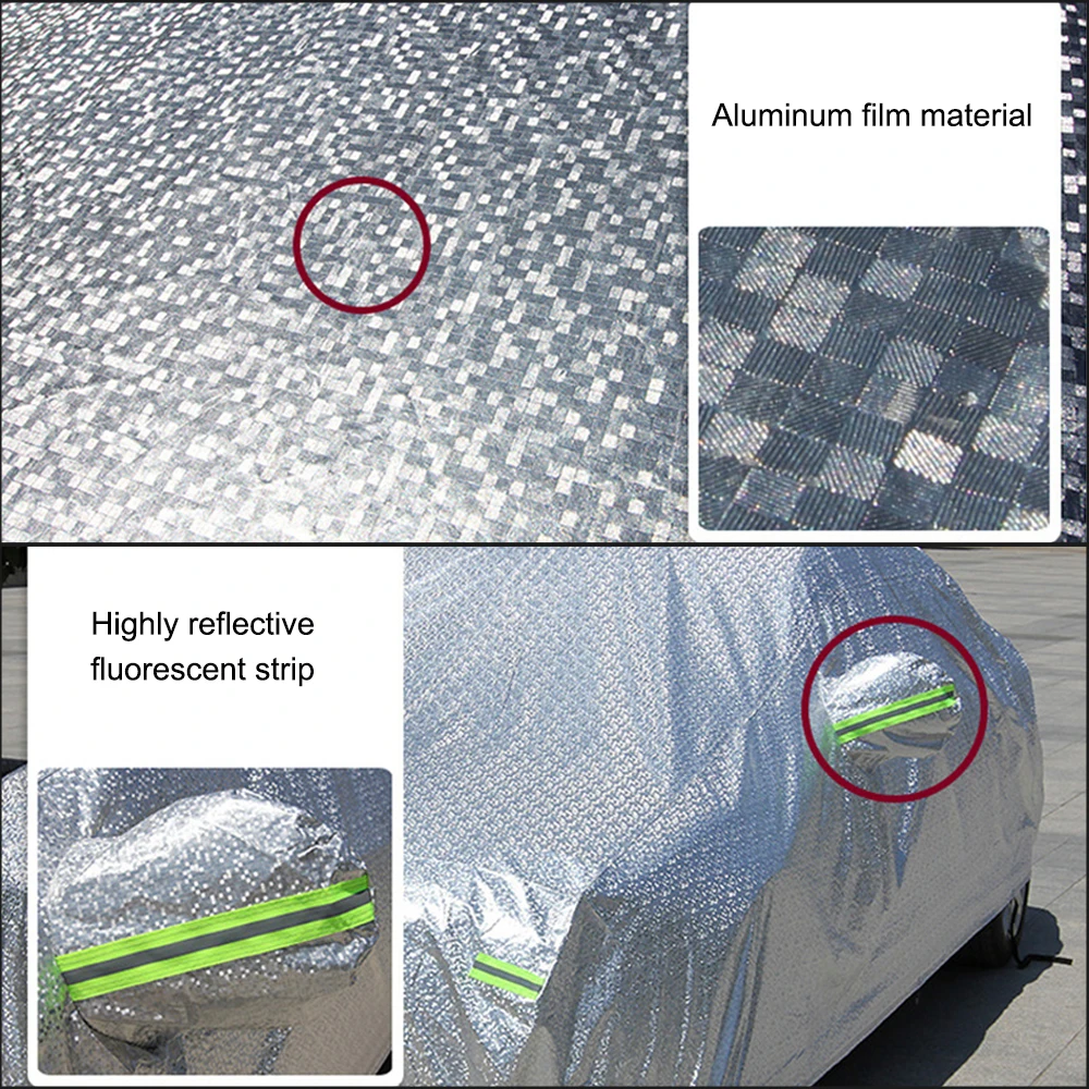 Серебристая алюминиевая пленка хорошо защищает от солнечных лучей и УФ-излучения, которая может поддерживать прохладу вашего автомобиля в жаркое лето. Внутренний утолщенный полипропиленовый хлопок мягкий для защиты краски автомобиля от царапин. Прикрепленные к передней, средней и задней части автомобиля светоотражающие Предупреждающие ленты крышки могут значительно предотвратить авария в темноте. В сочетании с эластичным подолом и двойным шитьем внизу регулируемые ветрозащитные ремни для 4 колес могут эффективно удерживать крышку даже в дождливую погоду и ветреную погоду.
