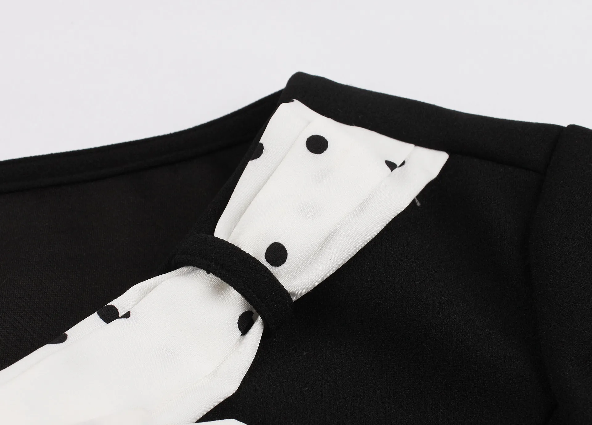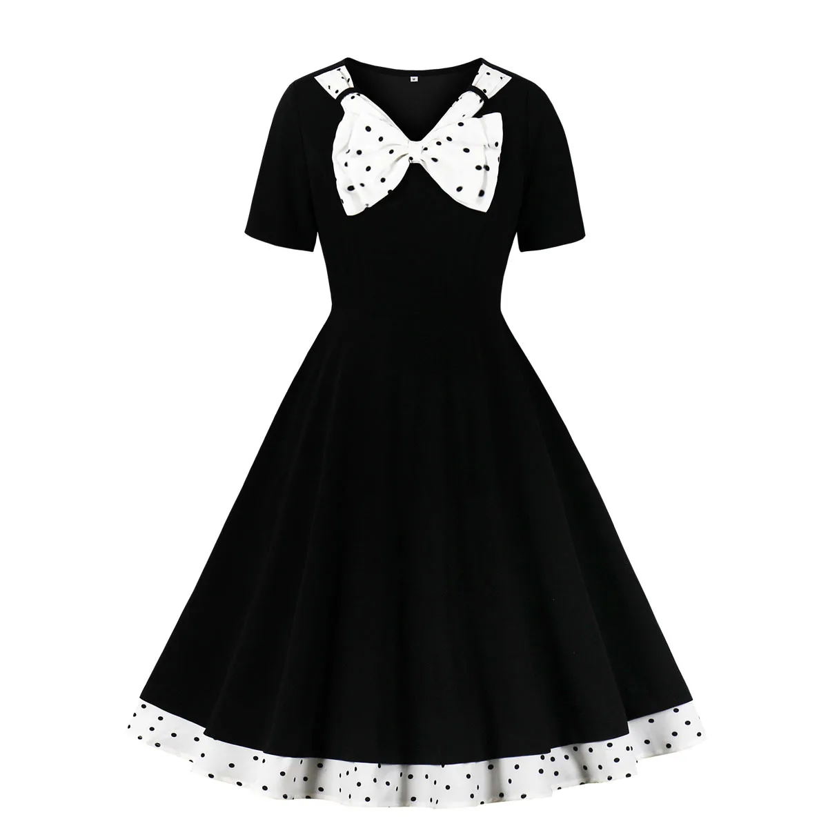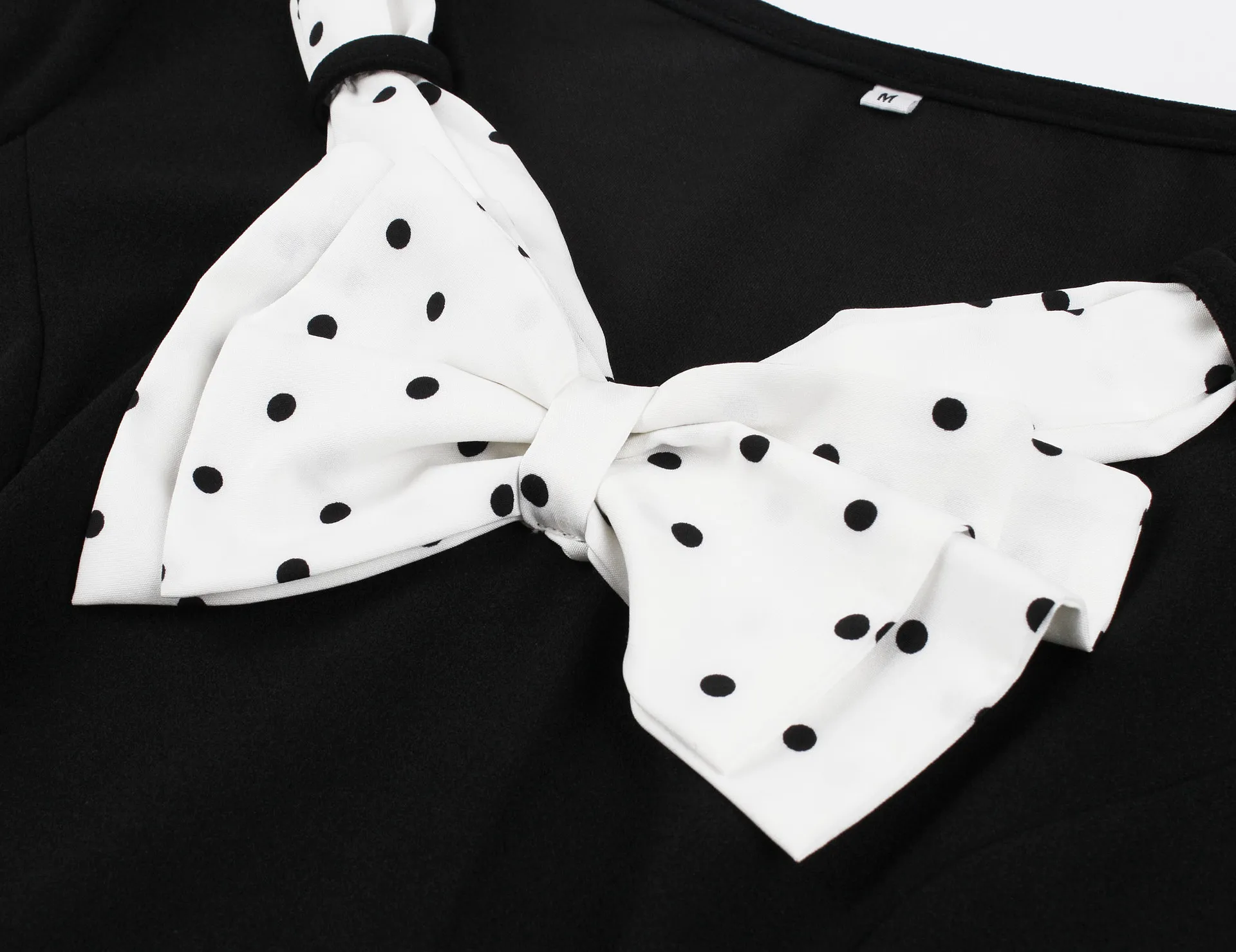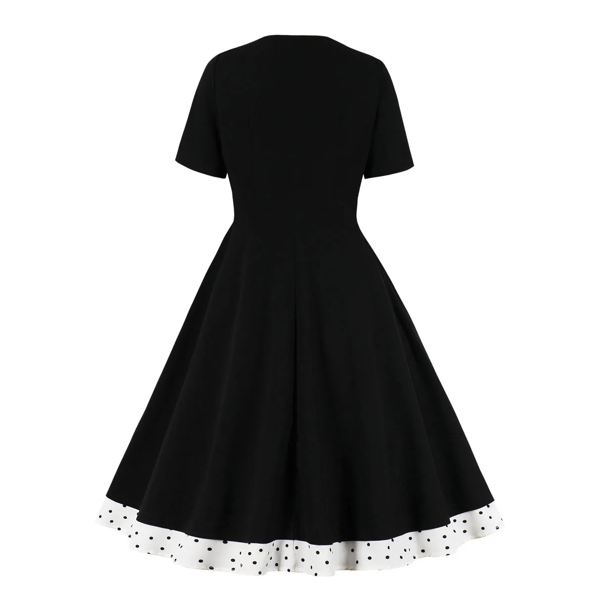 Винтажное ретро платье 50s VD1661 черное Хепберн элегантное платье с v-образным вырезом и большим бантом в горошек пэчворк размера плюс рокабилли