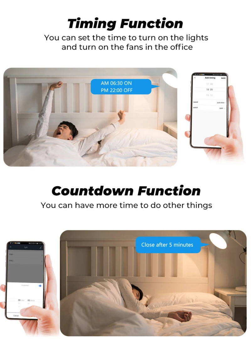 【Сроки】Смарт-переключатель автоматически включается и выключается в данный момент времени Через функцию таймера. Выберите время, которое вы хотите проснуться, Автоматически Откройте светильник, так что вы можете легко войти в день; Выберите Время, которое вы хотите закрыть светильник.