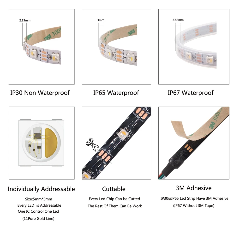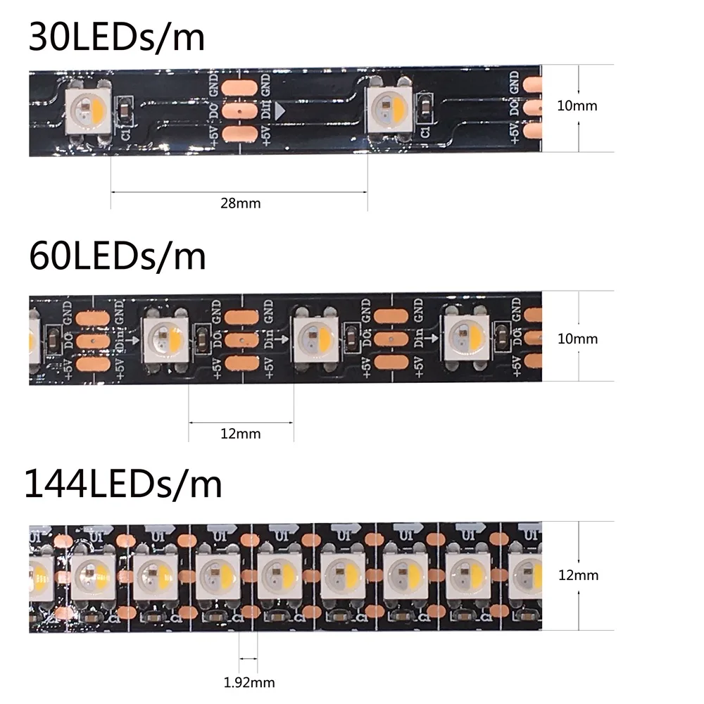 Примечание:Цена только Светодиодная лента, не включает блок питания или светодиодный контроллер!SK6812 RGBW должен использовать источник питания DC5V и светодиодный контроллер управления для управления!Если заказ не превышает 5 долларов США, номер отслеживания отсутствует!Каждый 0,5 метр с Паяные соединения, пожалуйста, обратите внимание!30, 60, 144: 30 светодиодов/м, 60 светодиодов/м, 144 светодиодов/мIP30: не водонепроницаемыйIP65: водонепроницаемое силиконовое покрытиеIP67: водонепроницаемый в силиконовой трубке(RGBCW 6000-6500K ;RGBWW 2700-3000K ; RGBNW 4000-4500K)Длина по вашему выборуСветодиодный источник: 5050SMD RGBW встроенный микросхема SK6812Напряжение (постоянный ток):5 ВМощность: 144 светодиодов/метр ------- 43,2 Вт/м60 светодиодов/метр --------- 18 Вт/м30 светодиодов/метр --------- 9 Вт/мТип светодиодный: SMD5050Тип ИС: SK6812Светодиодный/на метр: 30, 60144 светодиодный s/метр (Каждый светодиодный Светодиодный контроль отдельно)IC/на метр: 30, 60,144IC/метр (1 IC дисков 1 led чип)Пиксели/на метр: 30, 60144 пикселей/метрСерый класс: 256Цвет: RGBW (WW 2700-3000K ; CW 6000-6500K;NW 4000-4500K)Цвет печатной платы: белый/черныйКласс водонепроницаемости: IP30-----NON-водонепроницаемыйIP65 ----- эпоксидная смолаIP67 ----- силиконовая трубкаIP30,IP65, есть 3 м самоклеящаяся лента на задней стороне. Вы можете легко установитьПрименение:Подходит для украшения автомобиля и велосипеда, пограничного или контурного освещенияШироко используется для украшения дома, отелей, клубов, торговых центровАрхитектурное декоративное освещение, изысканное атмосферное освещениеШироко применяется при заднем освещении, скрытом освещении, освещении с буквенным каналомАварийное и безопасное освещение, рекламный знак освещенияДекоративные светильники для праздника, события, выставки