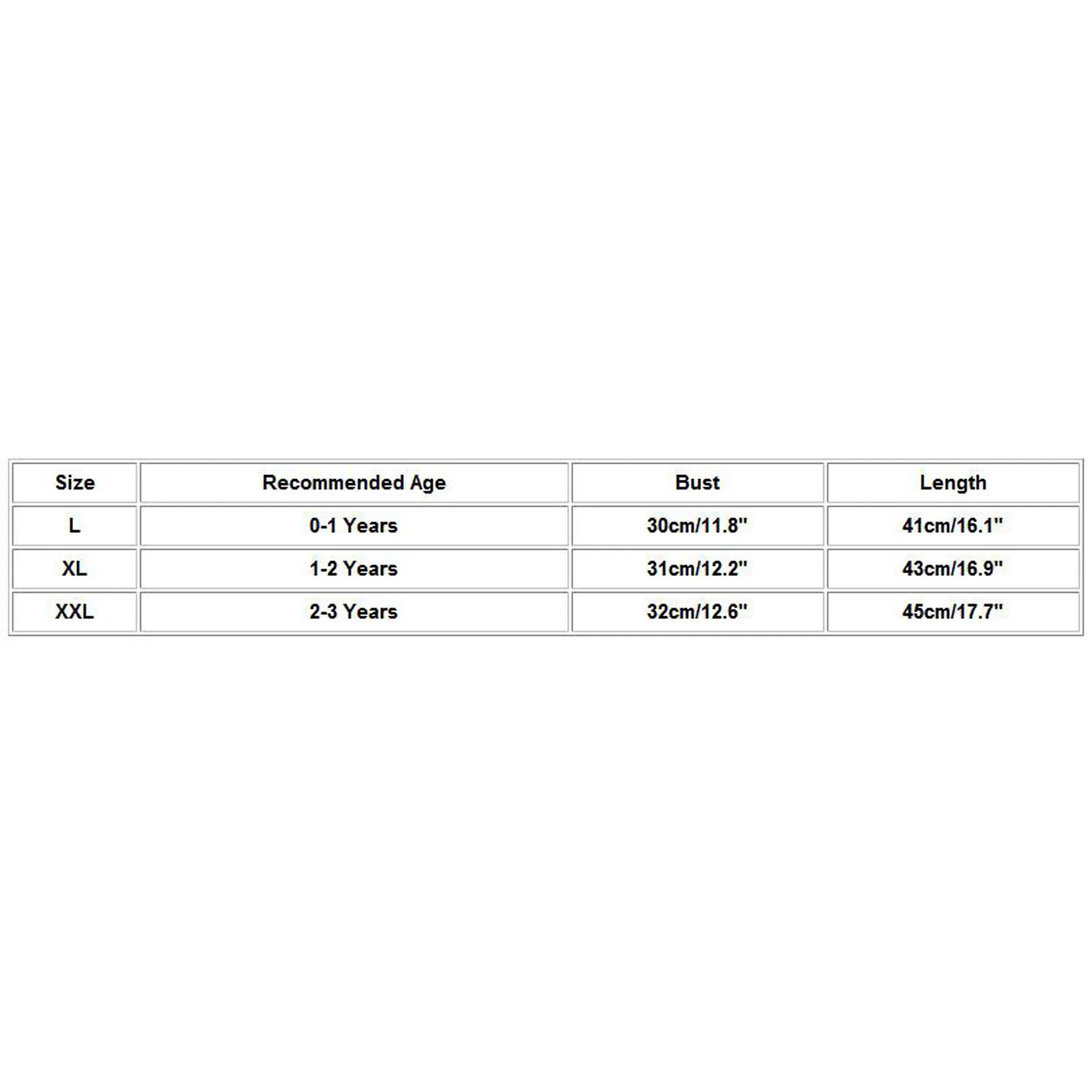 Размеры Рекомендуемый возраст Бюст Длина L От 0 до 1 года 30 см/11,8" 41 см/16,1" XL Для детей от 1 до 2 лет 31 см/12,2" 43 см/16,9" XXL От 2 до 3 лет 32 см/12,6" 45 см/17,7"