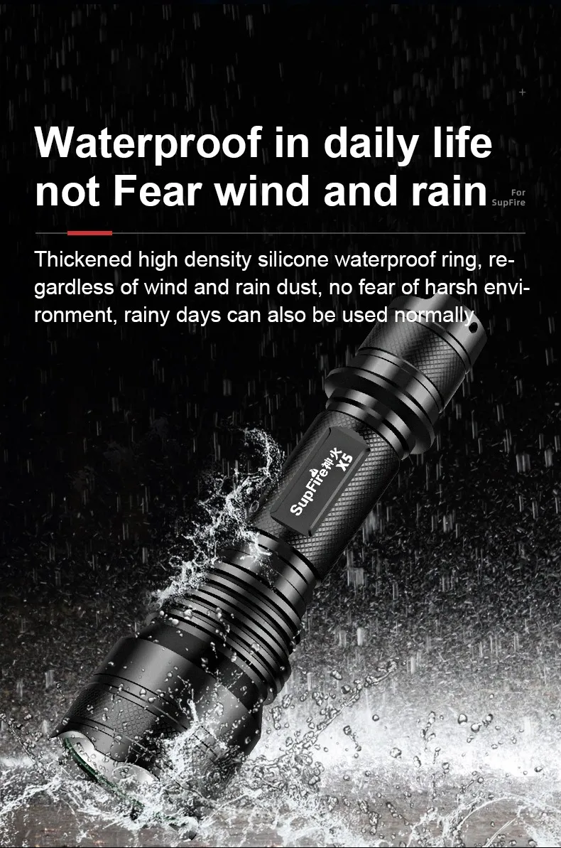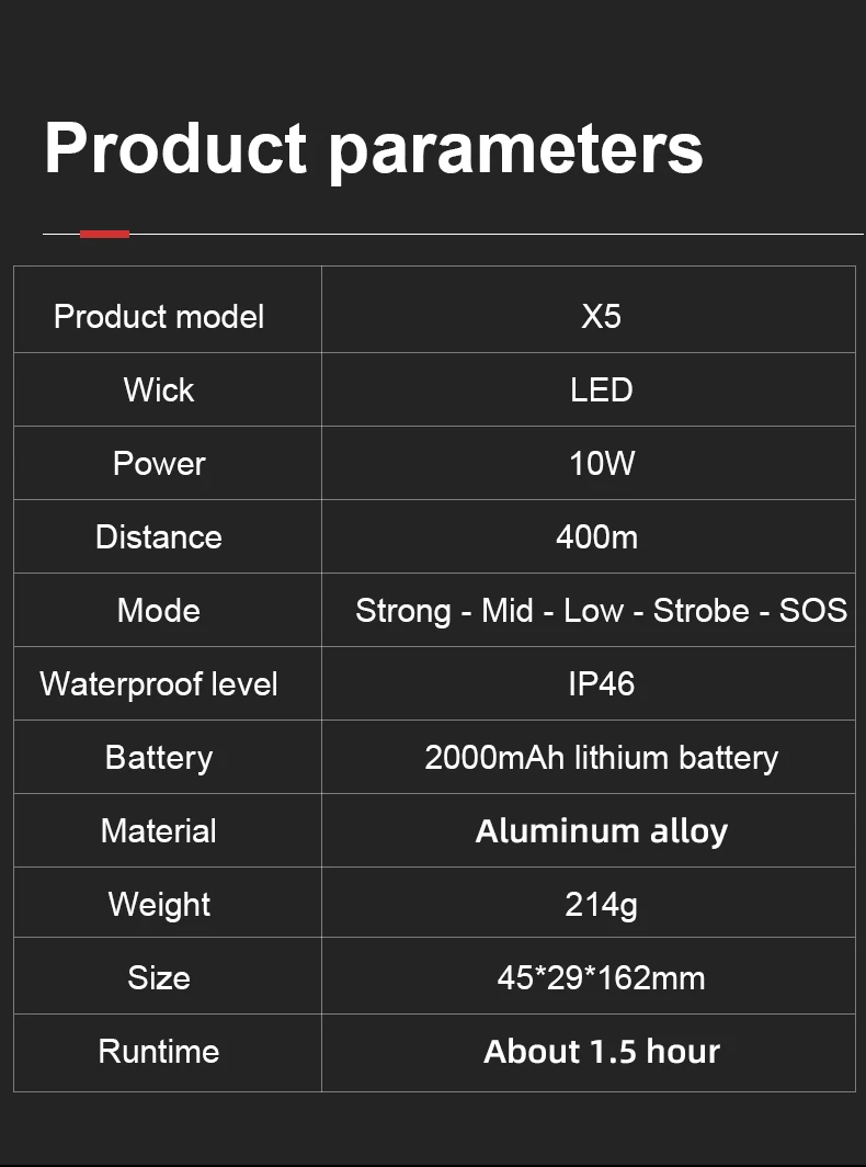 Пять режимов (высокий/средний/низкий/Стробоскоп/SOS) могут удовлетворить ваши потребности в различных условиях.