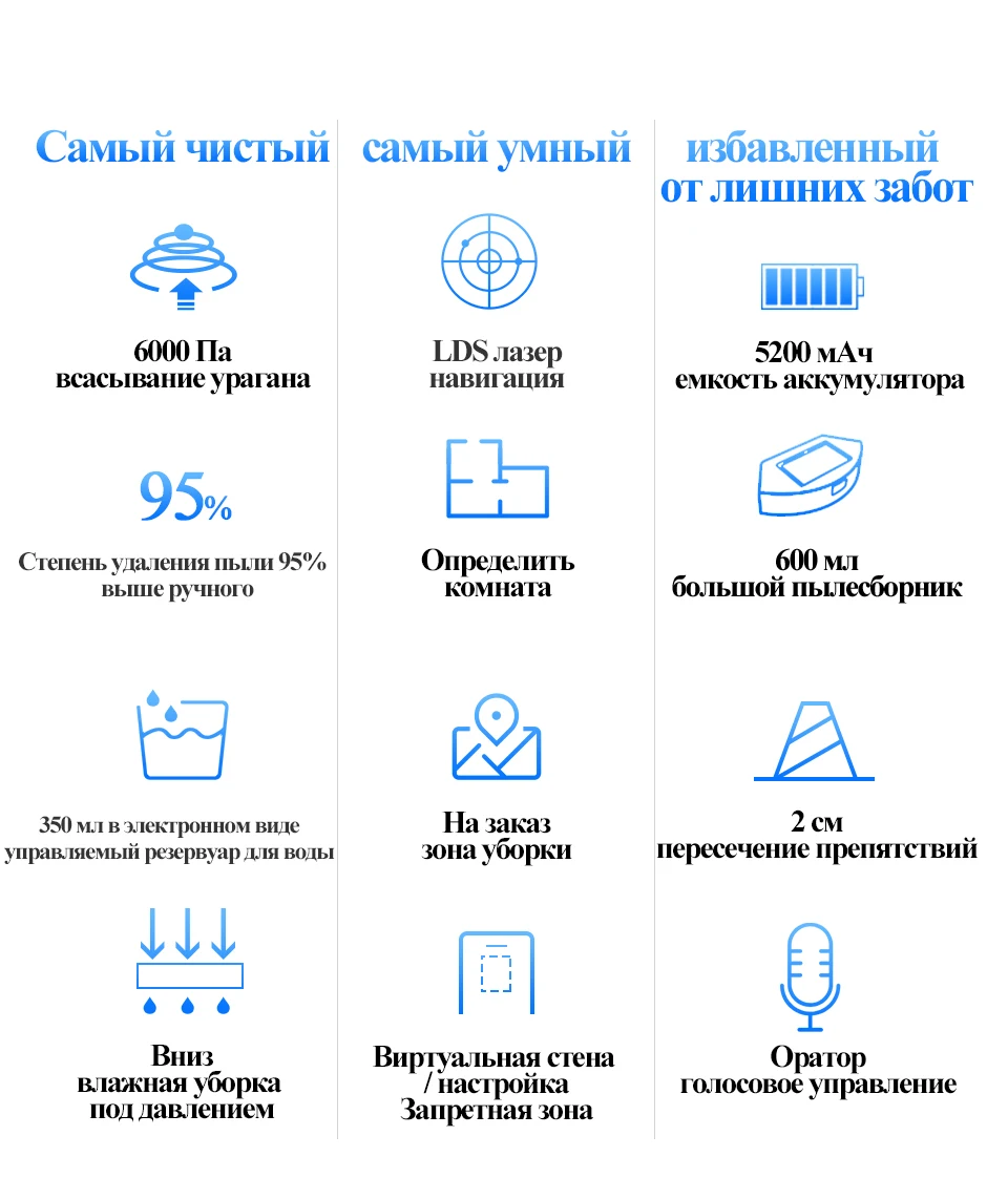 Аккумулятор большой емкости 5200ма/180 минут рабочее время 250 квадратных метров/площадь очистки