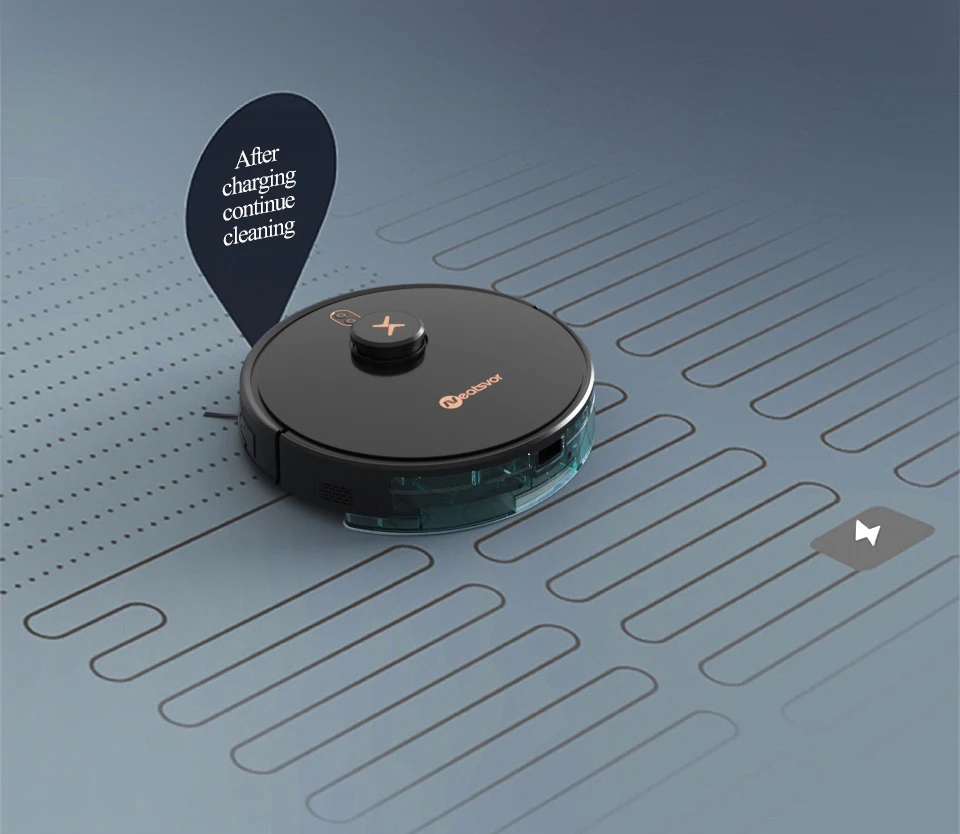 Когда заряд аккумулятора достигает минимального уровня, робот-пылесос устремляется к базовой станции для пополнения заряда, а затем продолжает цикл очистки с того места, где программа была прервана.