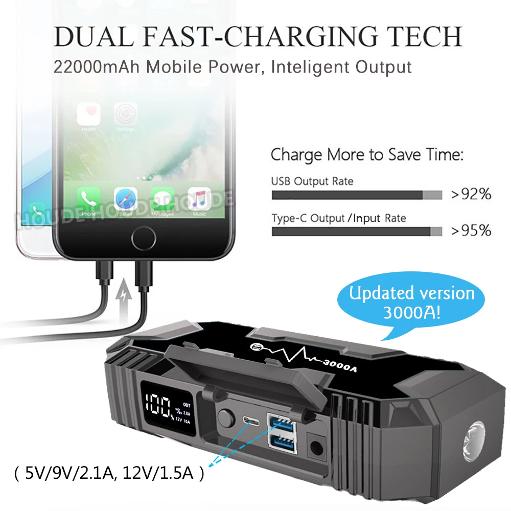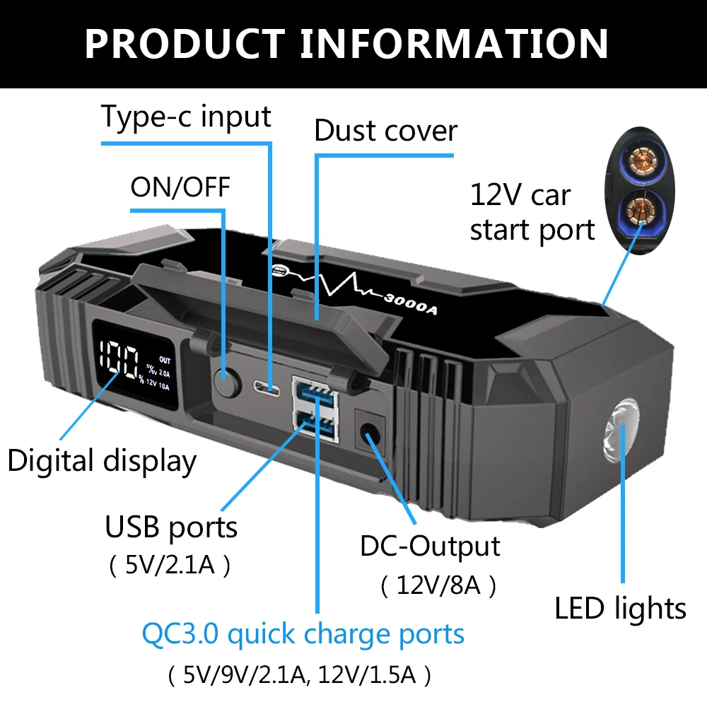 Максимальный ток 3000A, 12V автомобильное пусковое устройство, автомобильный Батарея усилитель, Мощность банки для 10.0RV и 8.0L бензиновый автомобиль